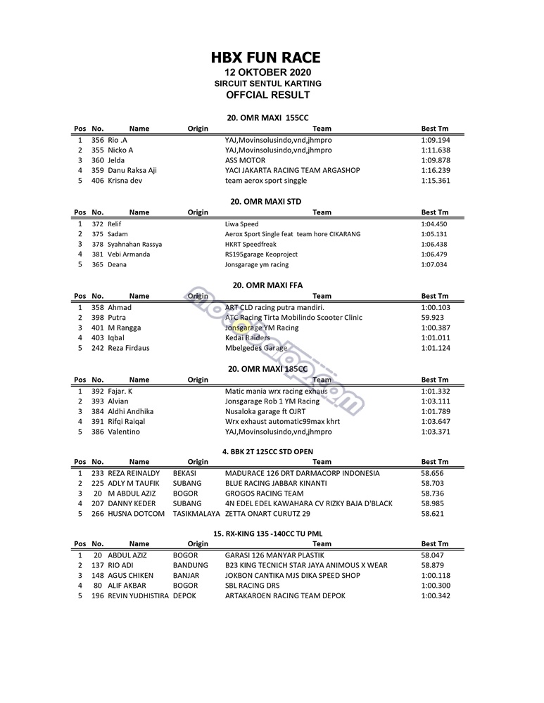 275 Peserta Banjiri HBX TWH Fun Race 2020, Ini Hasil Lengkapnya, MOTOBALAP.COM – Sebanyak 275 peserta yang terbagi dalam 18 kelas yang berkompetisi pada ajang balapan motor bertajuk HBX Twh Fun Race 2020 digelar di sirkuit Sentul Karting, Minggu (11/10/2020).