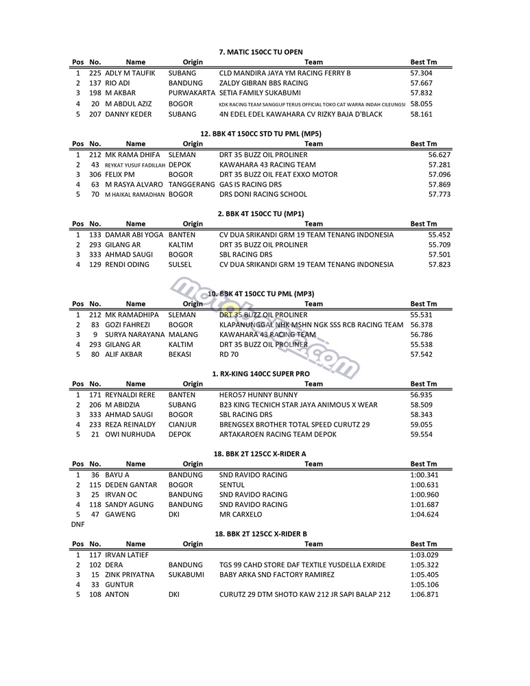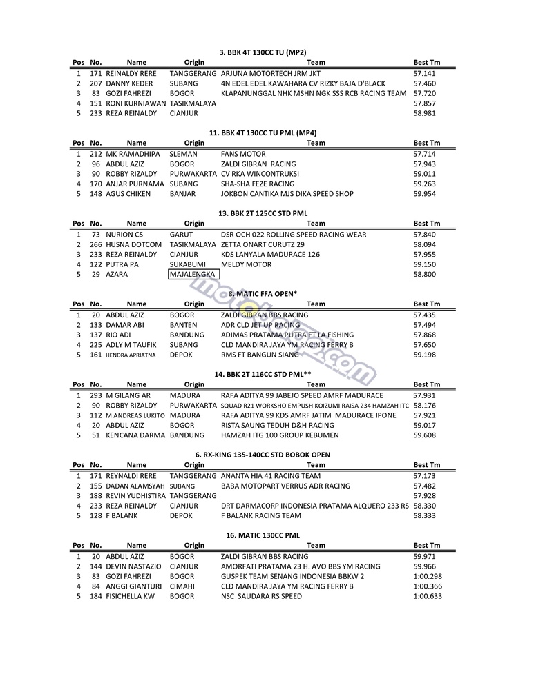 Pada kelas yang paling bergensi yakni Bebek 4 Tak 150cc Tune Up Seeded (MP1), Damar Abi Yoga yang berjasil menyelesaikan jalannya balapan di posisi pertama dengan catatan waktu 55.452. Ia bernaung pada tim CV Dua Srikandi GMR 19 yang berbasis di wilayah Jonggol.