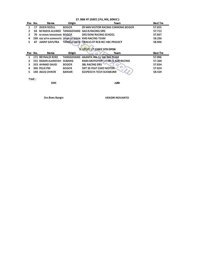 Reynaldi Rere asal tim Hero57 Hunny Bunny yang bermain di kelas raja jalanan yakni Rx King Super Pro berhasil finihs pertama dan mencetak waktu 56.935.