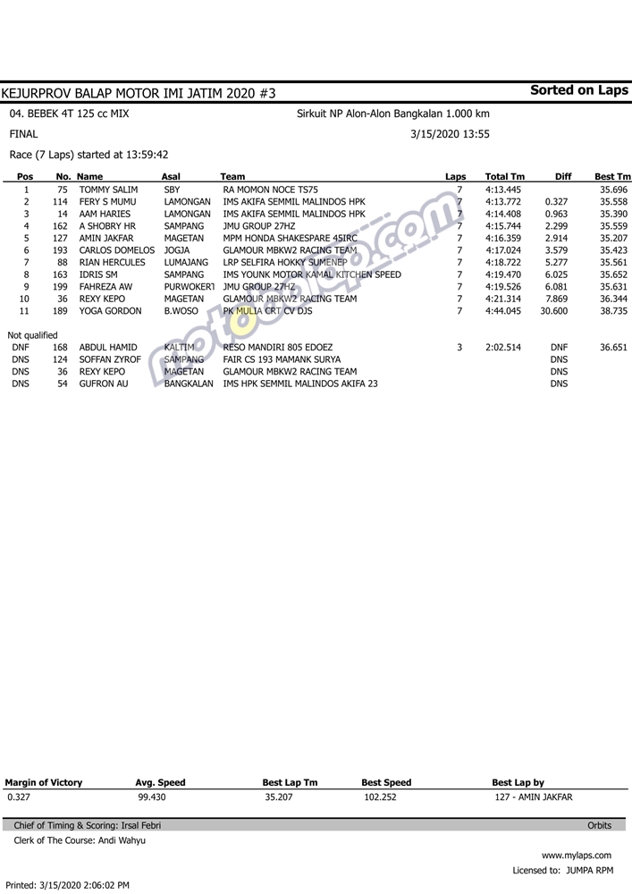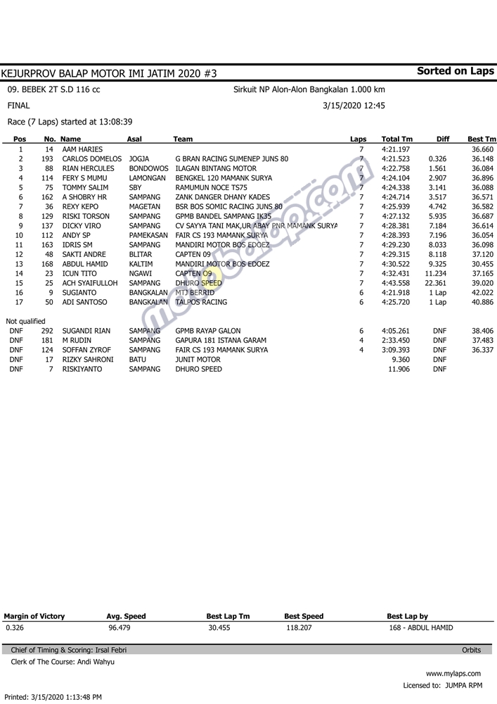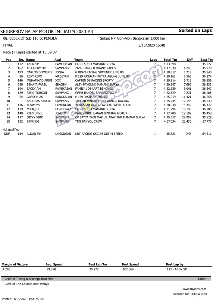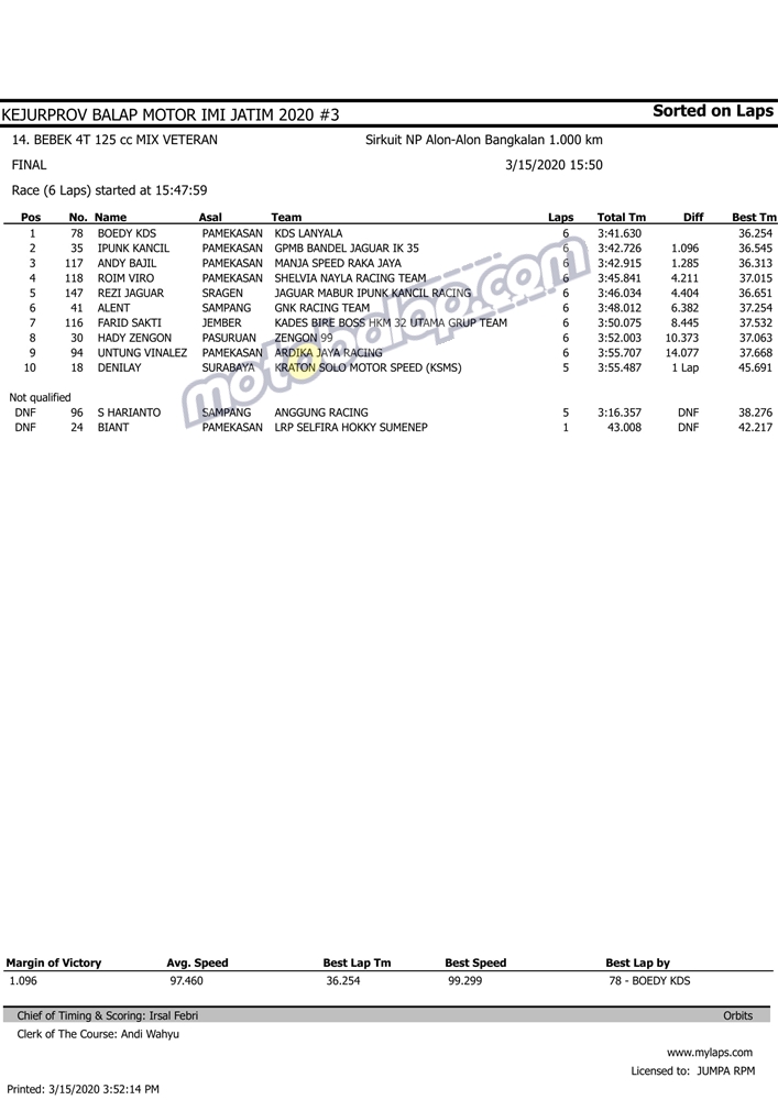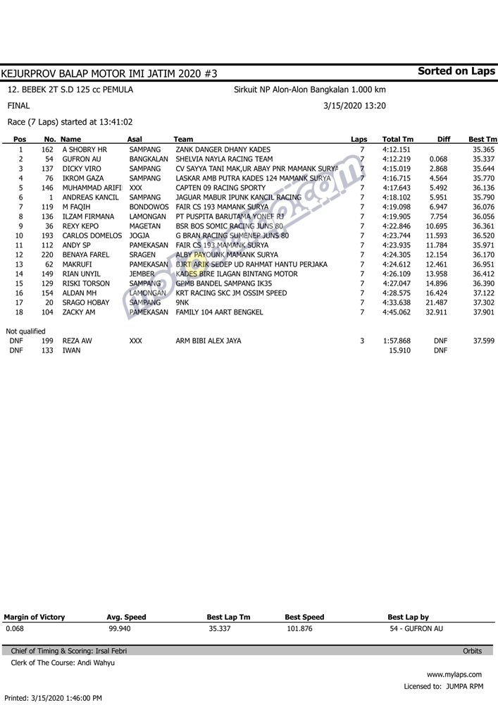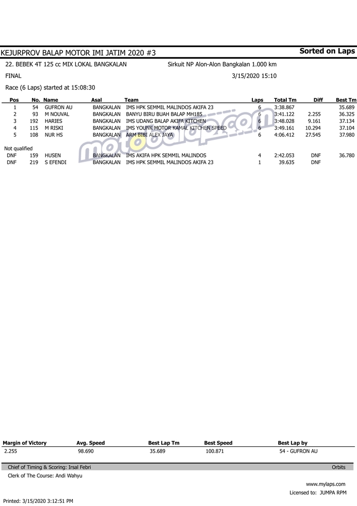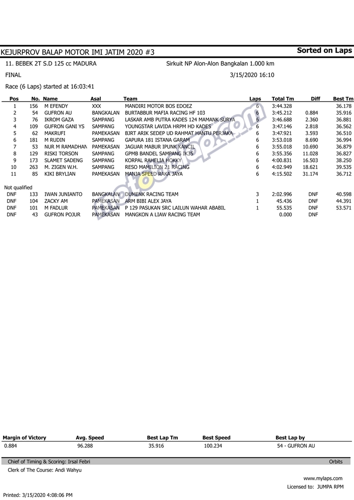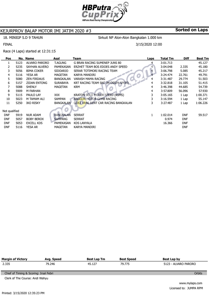 Untuk mengetahui hasil balapnya, dibawah ini kami lampirkan hasi Kejuaraan Provinsi Balap Motor Jawa Timur 2020 putaran 3 adalah sebagai berikut: