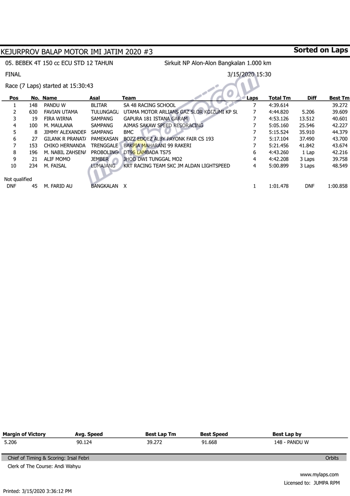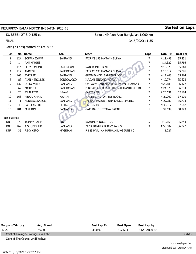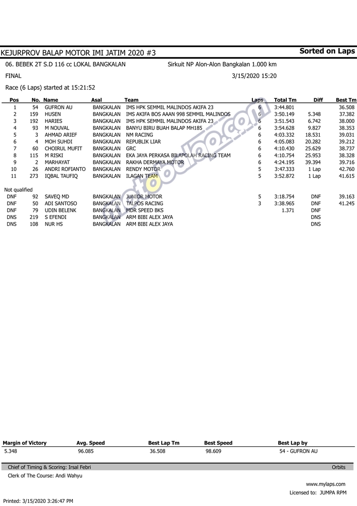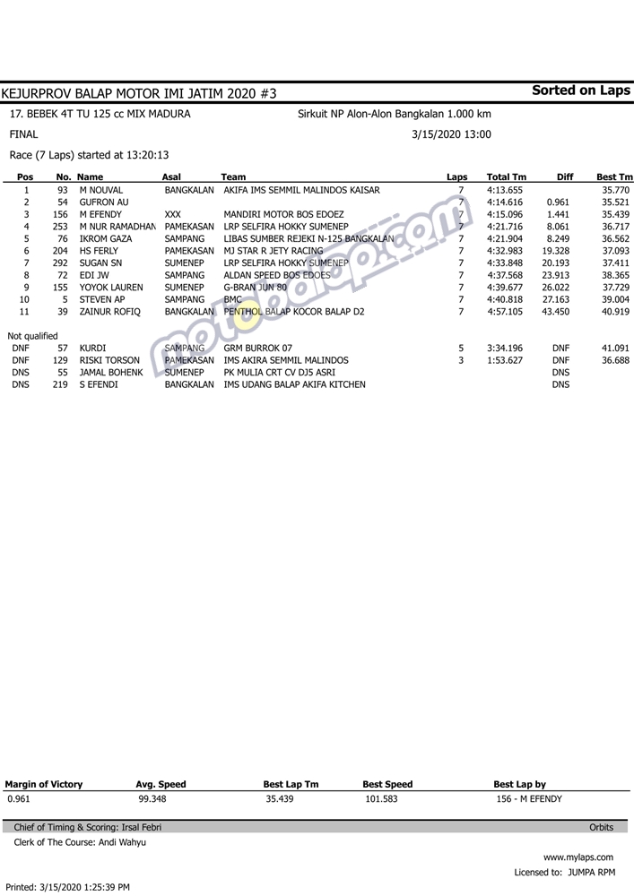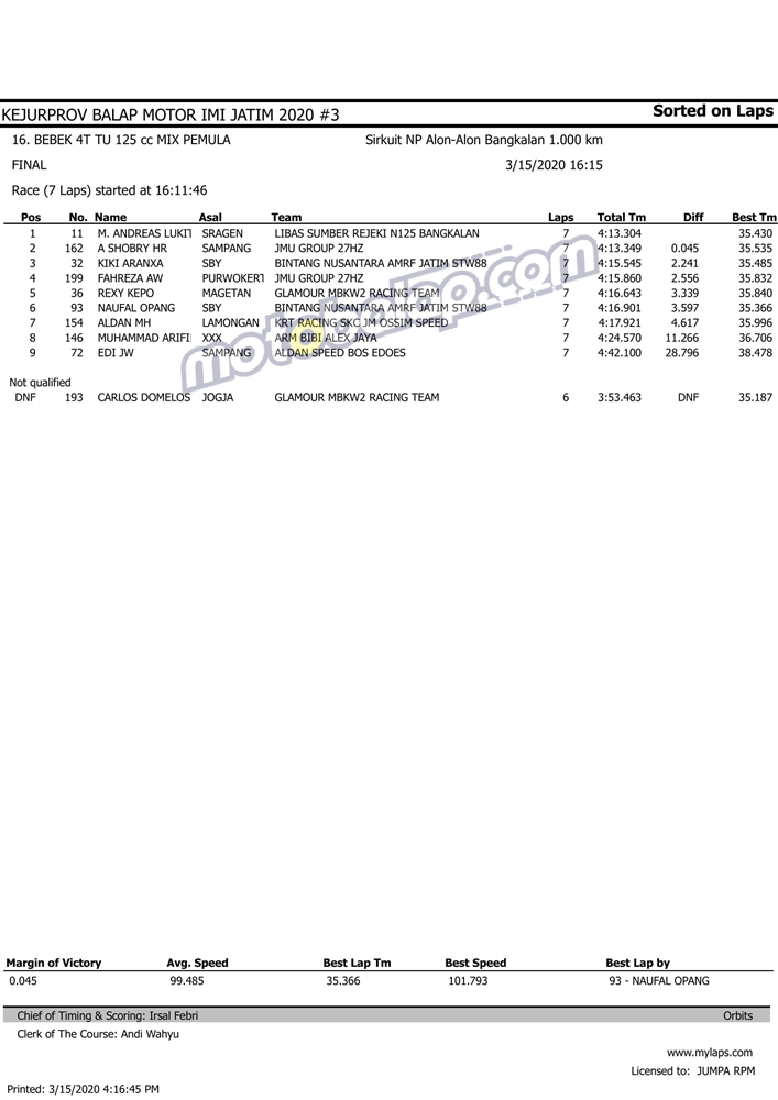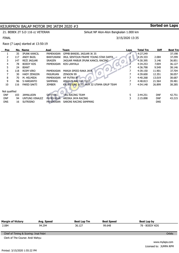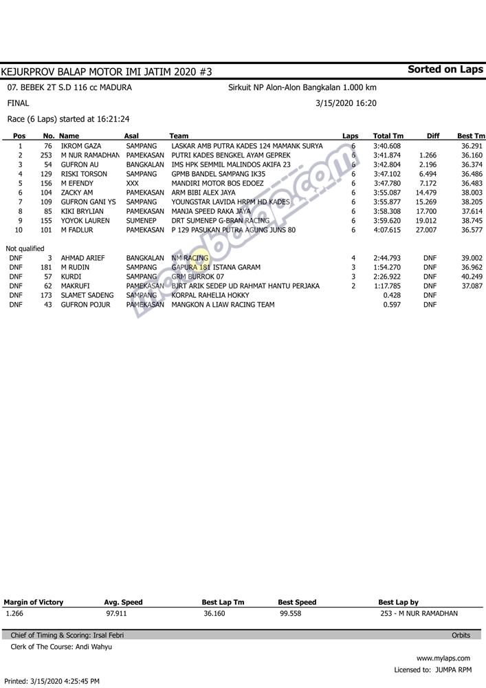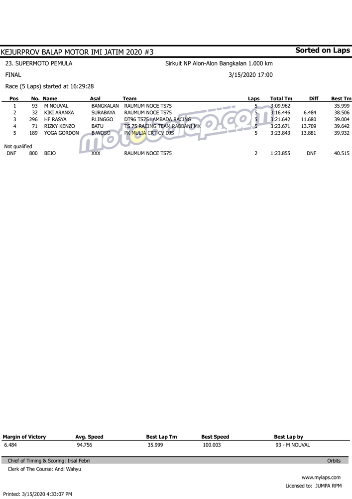 Untuk mengetahui hasil balapnya, dibawah ini kami lampirkan hasi Kejuaraan Provinsi Balap Motor Jawa Timur 2020 putaran 3 adalah sebagai berikut: