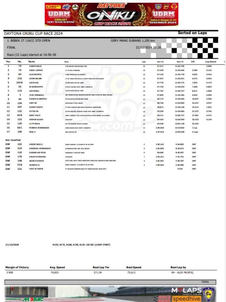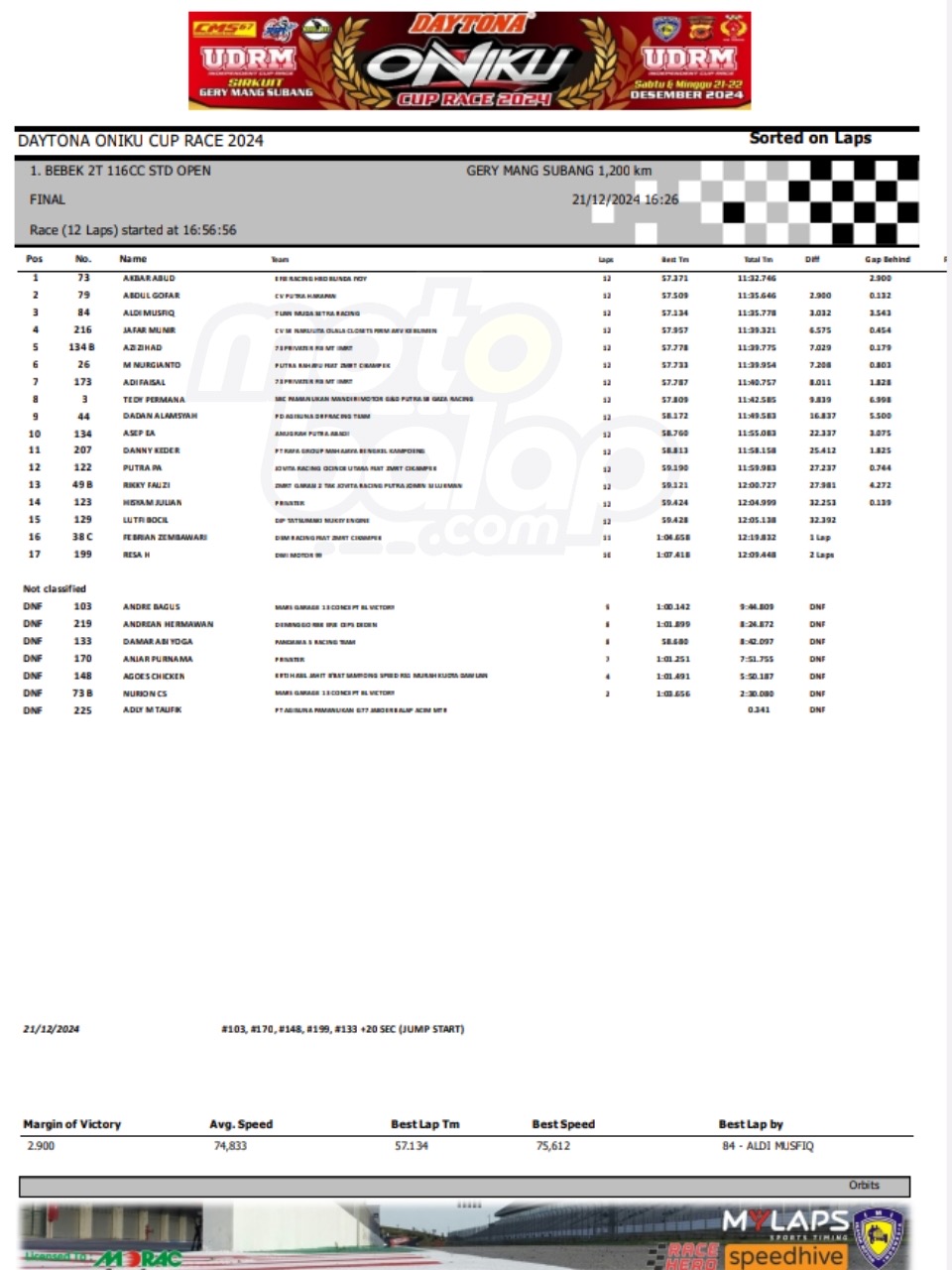 Di bawah ini merupakan hasil race Bebek 2Tak 116cc Standard Open Daytona Oniku UDRM Cup Race 2024 adalah sebagai berikut: