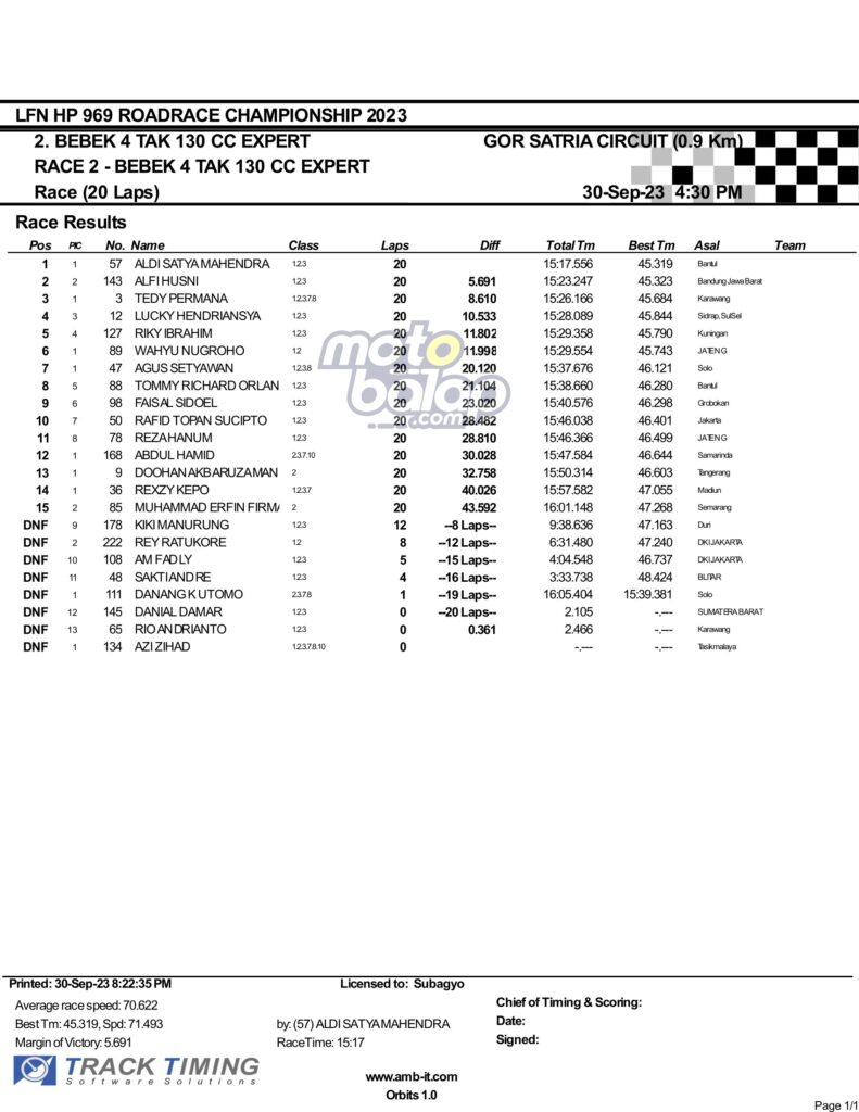 Di bawah ini merupakan hasil Race 2 LFN HP969 Road Race Championship 2023 Purwokerto katagori Bebek 4 Tak 130 cc Expert adalah sebagai berikut: