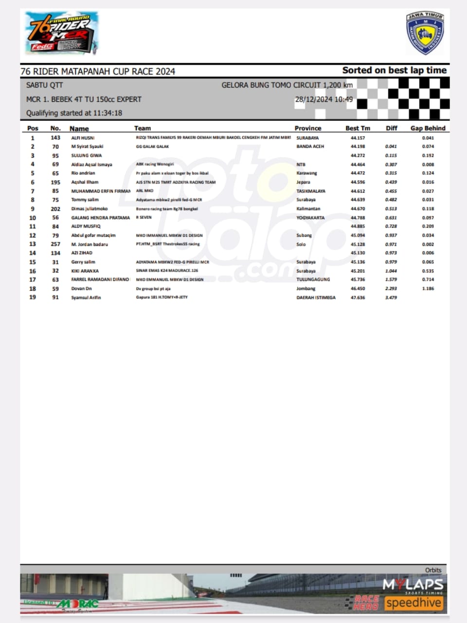 Di bawah ini merupakan hasil QTT Bebek 4T TU 150 Expert Final Matapanah Cup Race 2024 adalah sebagai berikut: