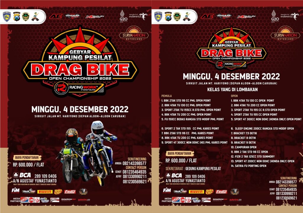MOTOBALAP.COM – Info menarik bagi para pecinta balap lurus 201 meter akan berlangsung akhir pekan ini (4 Desember) event megah garapan AE Indonesia Racing Organizer yang akan melangsungkan gelaran terakhirnya di tahun 2022 bertajuk Gebyar Kampung Pesilat Dragbike RWK Open Championship 2022