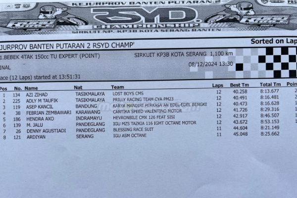 “Rasanya sangat senang bisa finish pertama di Kejurprov Banten Putaran 2 ini. Persaingan cukup ketat, tetapi saya fokus dan tetap jaga ritme balap hingga akhir. Terima kasih kepada tim dan semua yang mendukung saya,” ujar Azi Zihad kepada Motobalap.com usai podium.