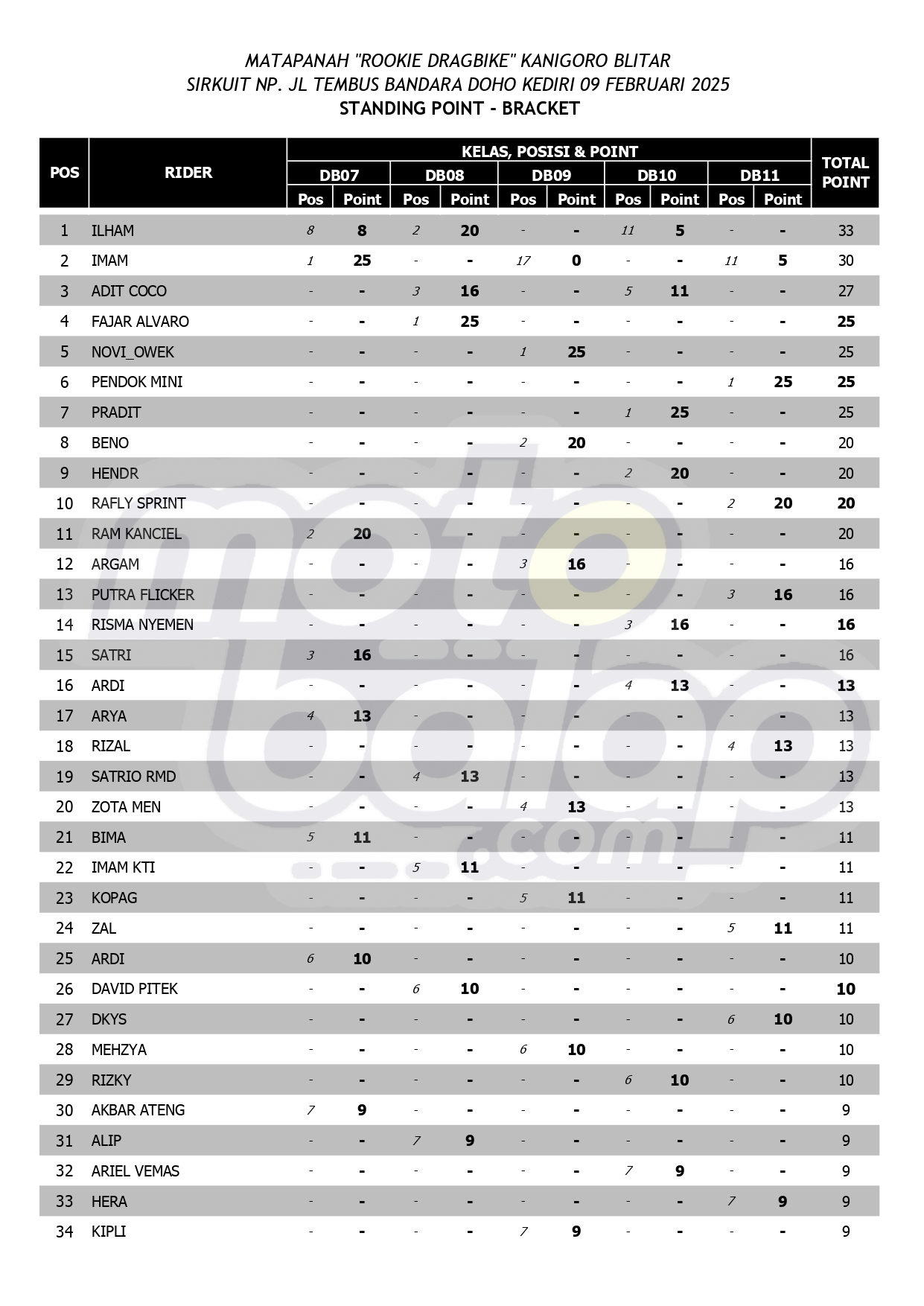 Berikut Adalah Klasemen Poin Akhir Matapanah Dragbike Rookie Edisi 1 Kediri 9 Februari 2025