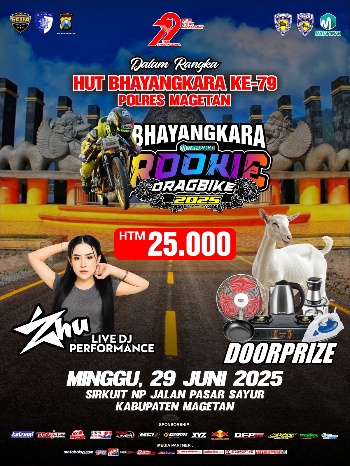 Jangan lewatkan keseruan Bhayangkara Rookie Dragbike 2025! Ajak teman dan keluarga untuk hadir dan ramaikan perayaan penuh gebrakan ini. Balap seru, hiburan keren, dan hadiah melimpah menanti Anda di Magetan!