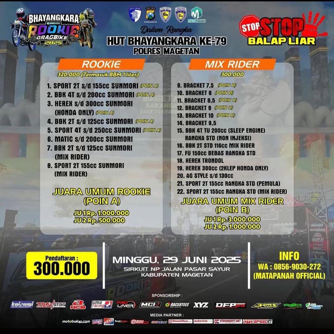 MOTOBALAP.COM – Dalam rangka memperingati HUT Bhayangkara ke-79, Polres Magetan bersama Matapanah Production siap menyuguhkan gelaran balap yang seru dan penuh hiburan bertajuk Bhayangkara Rookie Dragbike 2025.
