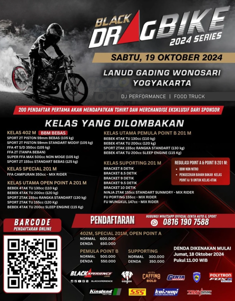 Black DragBike 2024 Series putaran terakhir garapan Genta Autosport membuka kelas 402 meter dengan regulasi bahan bakar bebas. Adapun kelas 201 meter dengan regulasi poin A dan poin B diwajibkan BBM non nitro. Demi sportivitas, kelas 4Tak akan diadakan pengecekan BBM.