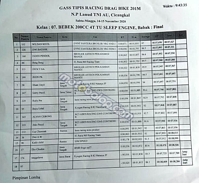 Broiler Kuasai Bebek 4 Tak 200cc TU Flat Engine. Wildan Kecil Tercepat Cetak 07.527 detik di Drag Bike Gass Tipis Cicangkal, MOTOBALAP.COM – Persaingan sengit kembali terjadi di final kelas Bebek 4 Tak TU 200cc Flat Engine yang berlangsung Minggu 15 November 2020 di Lanud cicangkal.