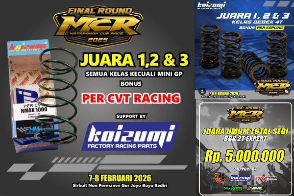 MOTOBALAP.COM – Dukungan dari industri racing kembali menguatkan prestise Final Round Matapanah Cup Race (MCR) 2025 yang akan digelar pada 7–8 Februari 2026 di Sirkuit Non Permanen GOR Joyo Boyo, Kediri. Dua brand ternama, Koizumi Factory Racing Parts dan TRAstar, memastikan komitmennya untuk tetap mendukung penuh gelaran penutup musim balap tersebut.