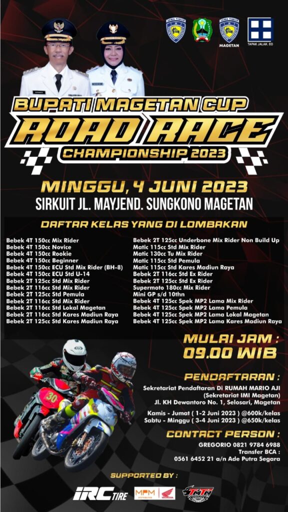 MOTOBALAP.COM – Kembali agenda road race Jawa Timur (Jatim) akan bergulir 4 Juni 2023 akhir pekan ini di sirkuit non permanen Jl. Mayjen Sungkono, Magetan, Jawa Timur.