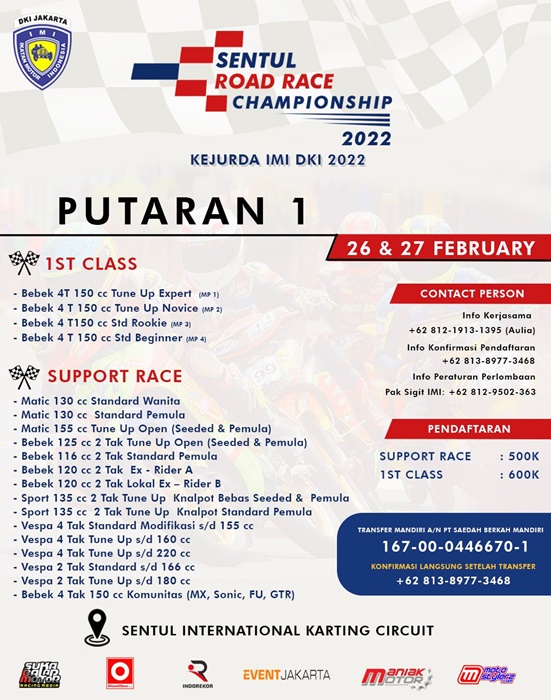Putaran Pertama Kejurda IMI DKI Jakarta Sentul Road Race Championship 2022 yang akan berlangsung di Sentul Sirkuit Karting Internasional 26-27 Februari 2022 mendatang.