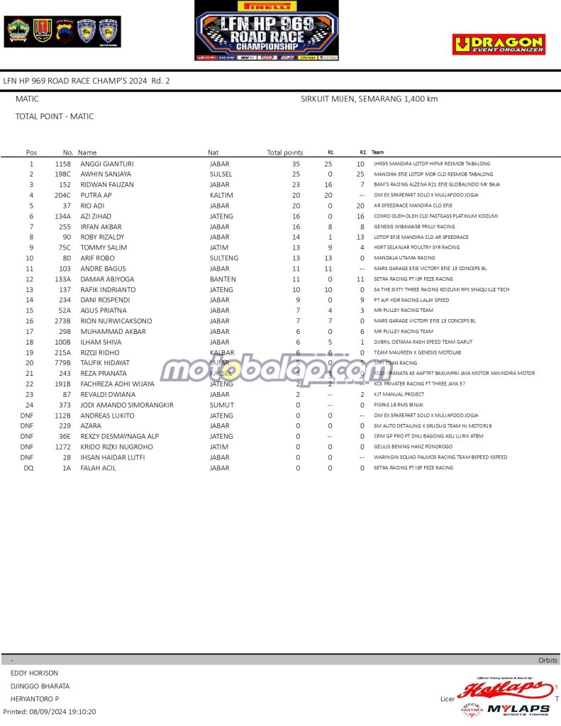 MOTOBALAP.COM- Berikut ini merupakan daftar Perolehan Poin dan Juara Umum LFN HP969 Road Race Championship Putaran 2 Mijen Semarang.