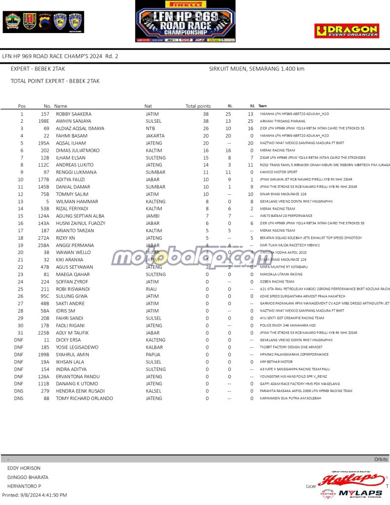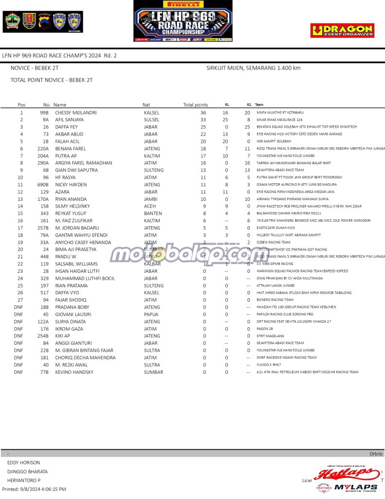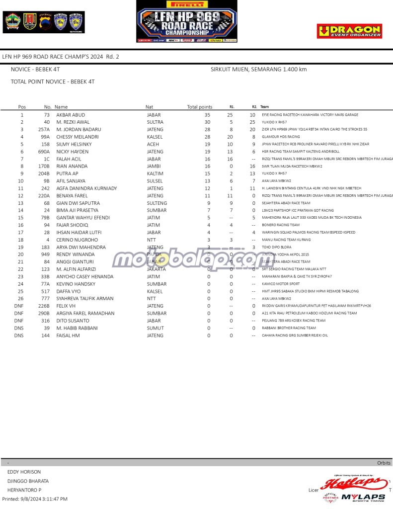 MOTOBALAP.COM- Berikut ini merupakan daftar Perolehan Poin dan Juara Umum LFN HP969 Road Race Championship Putaran 2 Mijen Semarang.