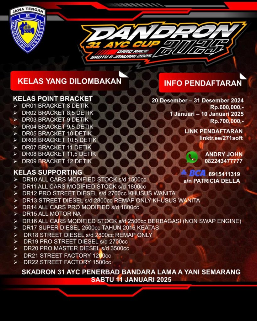 Dandron 31 AYC CUP Drag Race 2025, yang telah menjadi salah satu acara balap paling ditunggu-tunggu, akan menghadirkan kategori balap dari berbagai kelas, mulai dari kelas poin bracket hingga kelas supporting di mana penampilan mobil modifikasi ekstrem seperti pro master diesel sampai dengan 3500cc.