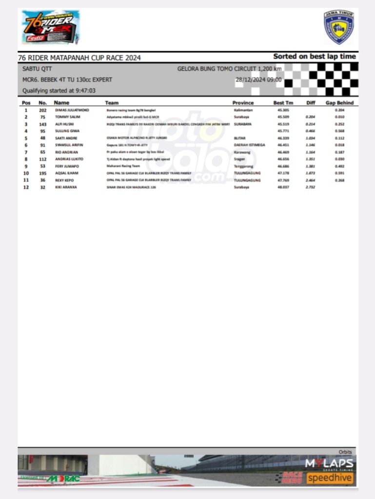 Di bawah ini merupakan hasil QTT Bebek 4T TU 130 Expert Final Matapanah Cup Race 2024 adalah sebagai berikut: