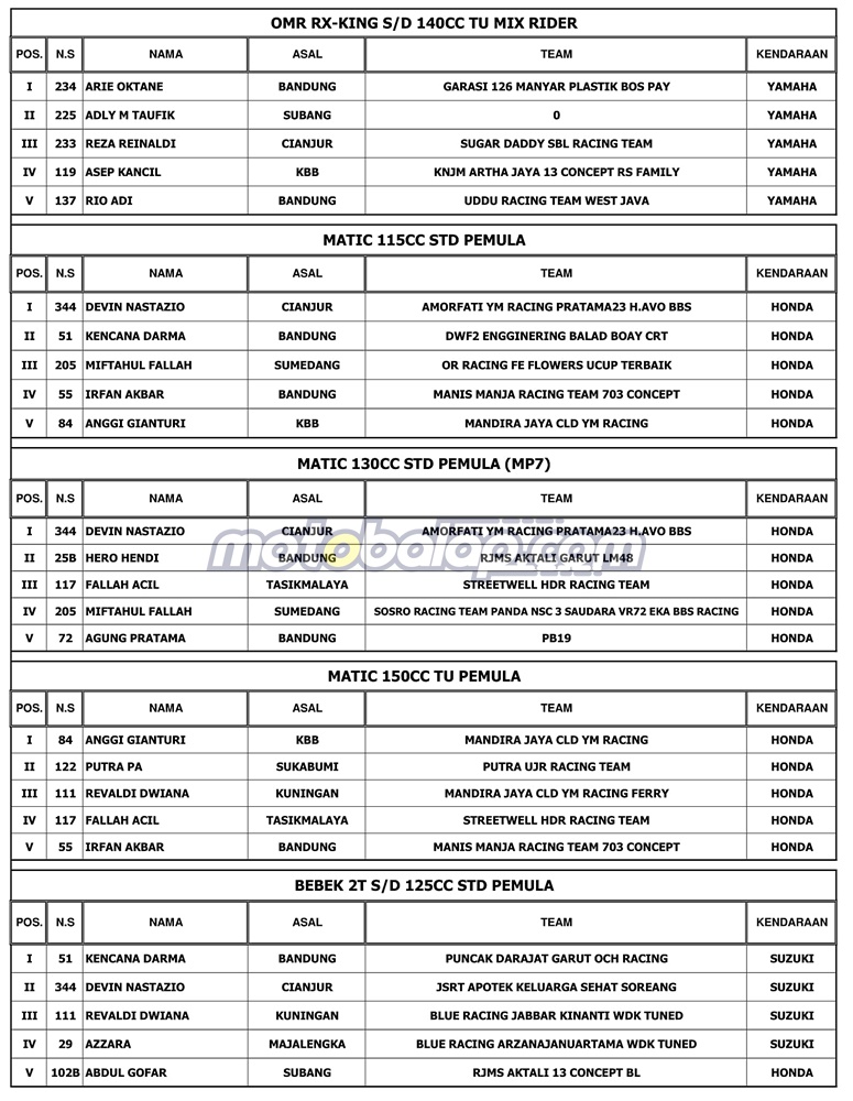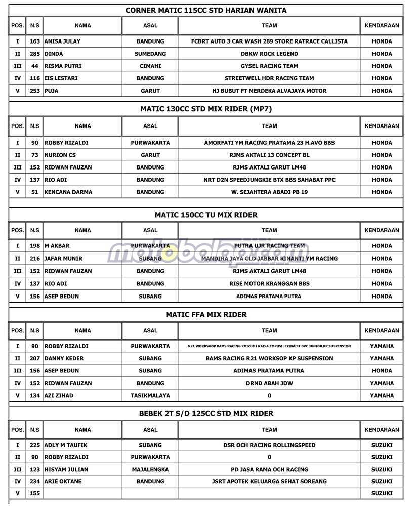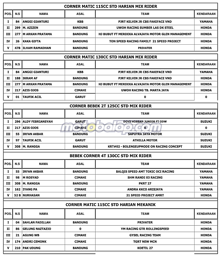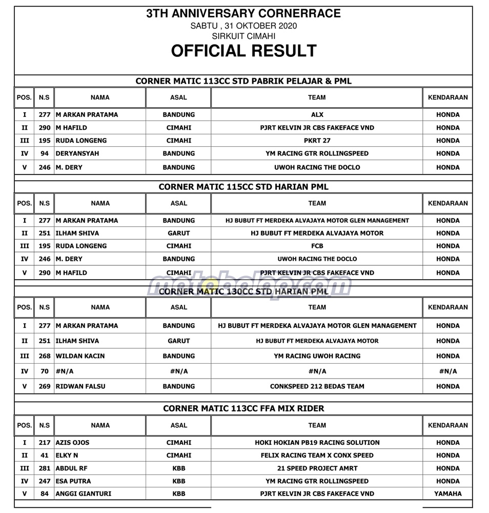 Dibawah ini meruapakan hasil lengkap 3th Anniversary Cornerrace yang dihelat di Sirkuit non-permanen Brigif, Cimahi, Sabtu (31/10/2020) adalah sebagai berikut: