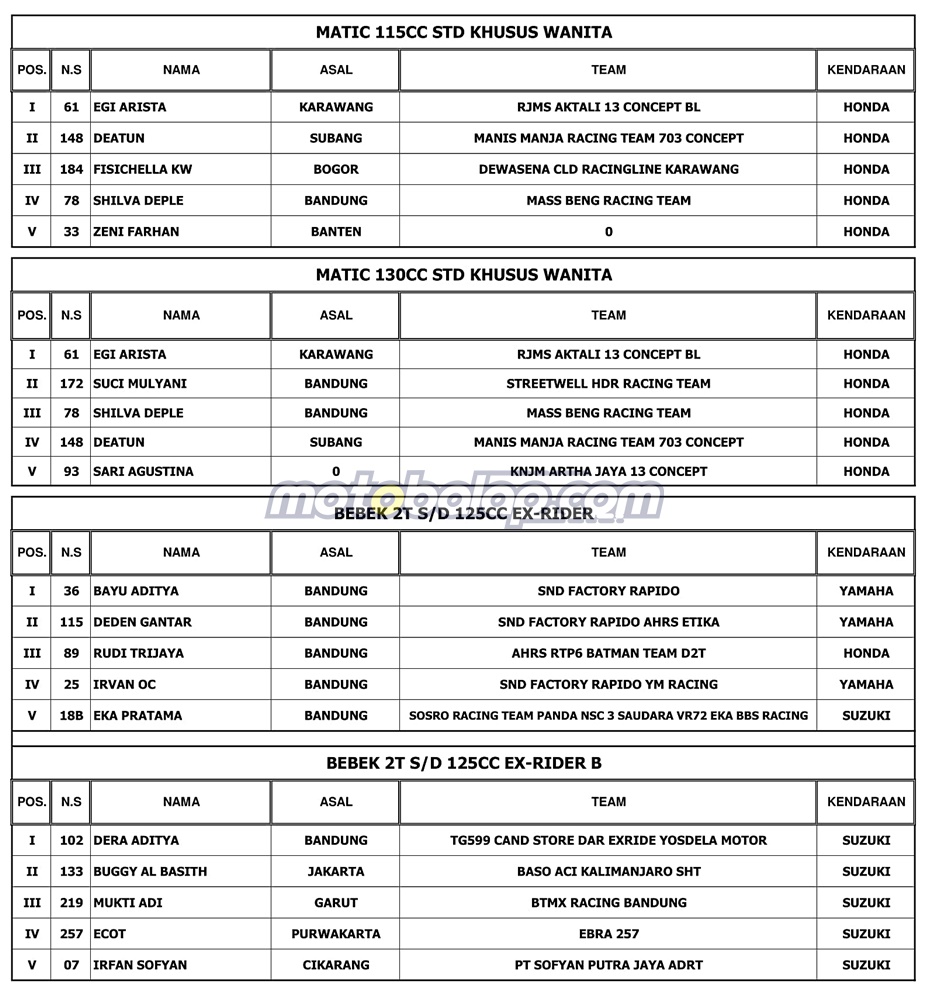 Pada kelas Bebek 2Tak sampai dengan 125cc Ex-Rider yang berhasil menjadi jawara ialah Bayu Aditya (SND Factory Rapido) kemudian di susul oleh Deden Gantar yang juga membela tim SND Factory Rapido AHRS Etika lalu di susul oleh owner tim Trijaya Racing yakni Rudy Trijaya yang bernaung di tim AHRS RTP6 Batman Team D2T.