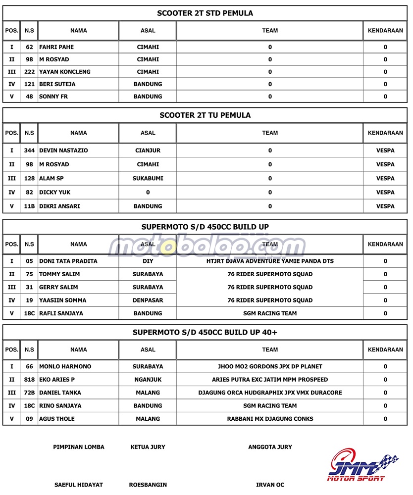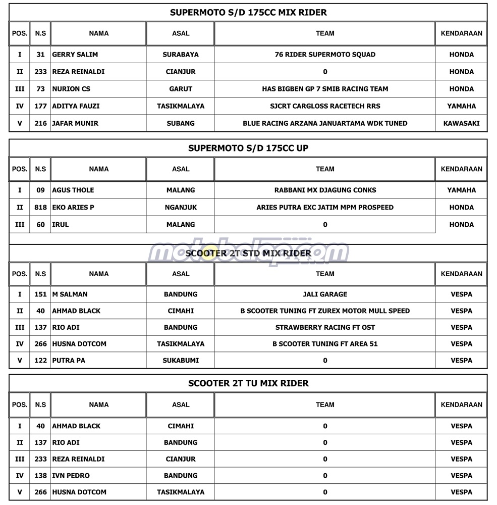 Donny Tata Pradita (HTJRT Djava Adventure Yamie Panda DTS) berhasil finish pertama di kelas Supermoto sampai dengan 450cc Build Up kemudian di susul oleh tiga pebalap 76 Rider Supermoto Squad diantaranya Tommy Salim di posisi ke 2 lalu, Gerry Salim pada tempat yang ke 3 dan Yasin Somma pada podium ke 4.