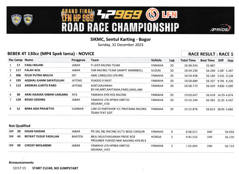 MOTOBALAP.COM – Fadli Rigani pebalap P-Leer Racing Team berhasil menempati podium pertama kelas Bebek 4T 130cc Novice (MP4 Spek Lama) di ajang Final LFN HP 969 Road Race Championship 2023 yang dihelat di Sentul Karting Internasional Sirkuit, Minggu (31/12/2023).