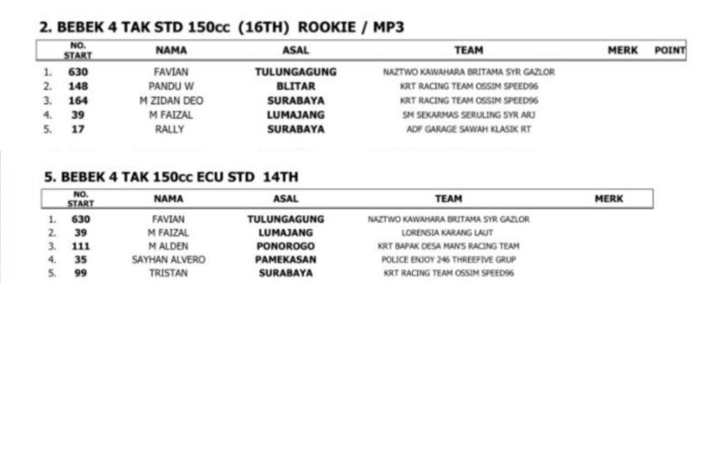 MOTOBALAP.COM – Penampilan terbaik, kembali di tunjukan oleh Favian salah satu pebalap bertalenta yang kini masih memiliki usia muda dan produktif. Dalam penampilannya kali ini pada ajang Final Kejurpov Jatim (24/12), bersama Naztwo Kawahara Britama Syr Gaz Slor ia berhasil dua kali naik podium pertama.