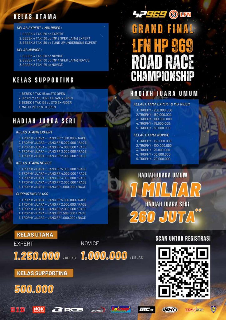 MOTOBALAP.COM – Ajang balap motor akhir tahun 2023 bertajuk LFN HP 969 Road Race Championship 2023 mencapai babak final yang dihelat di Sentul Karting International Circuit, 30-31 Desember 2023.