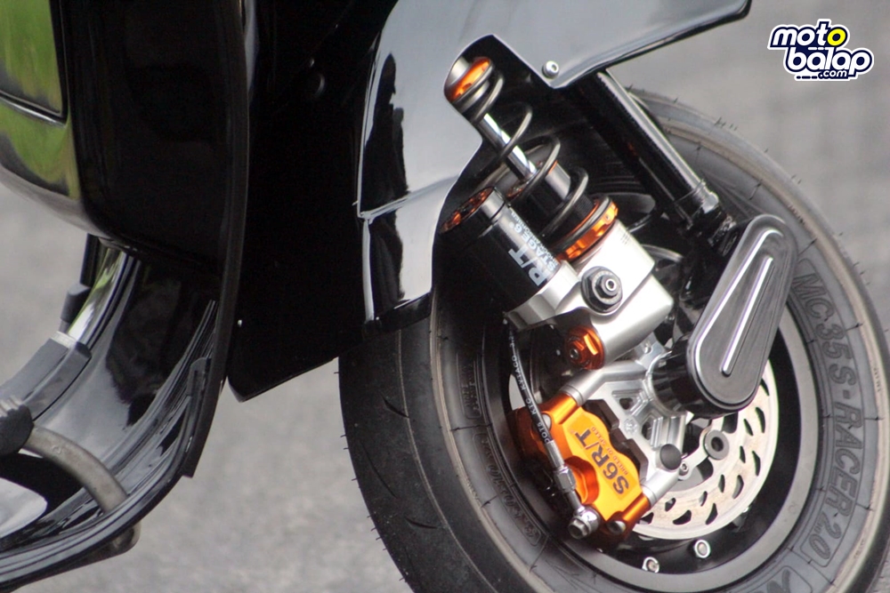 Lanjut ke kaki-kaki, Bang Jo akui banyak part yang dipakai adalah impor, walaupun velg andalkan produk lokal. Seperti suspensi dan paket pengereman itu juga impor.