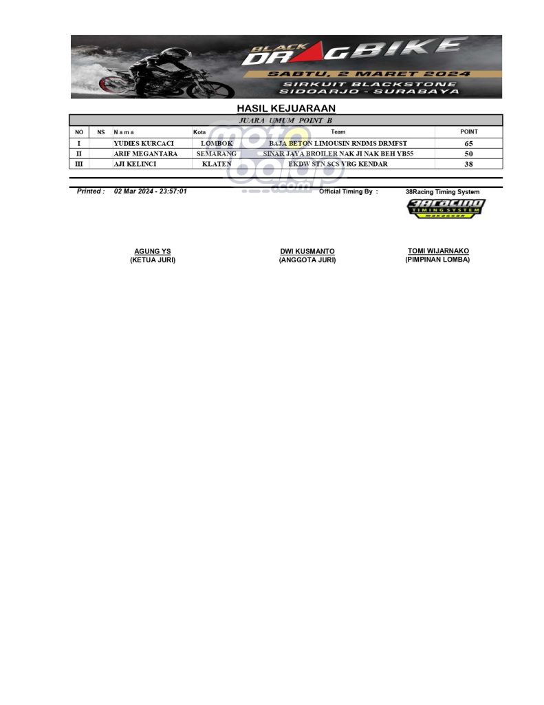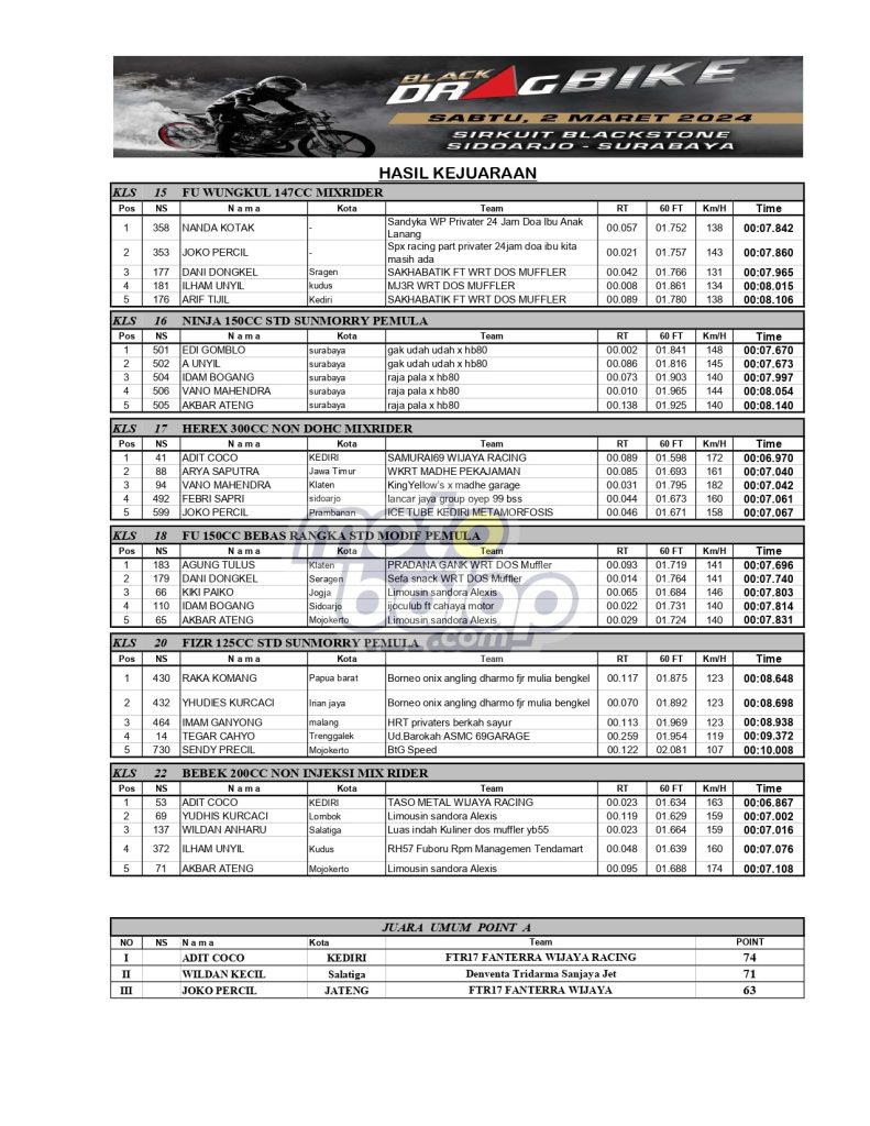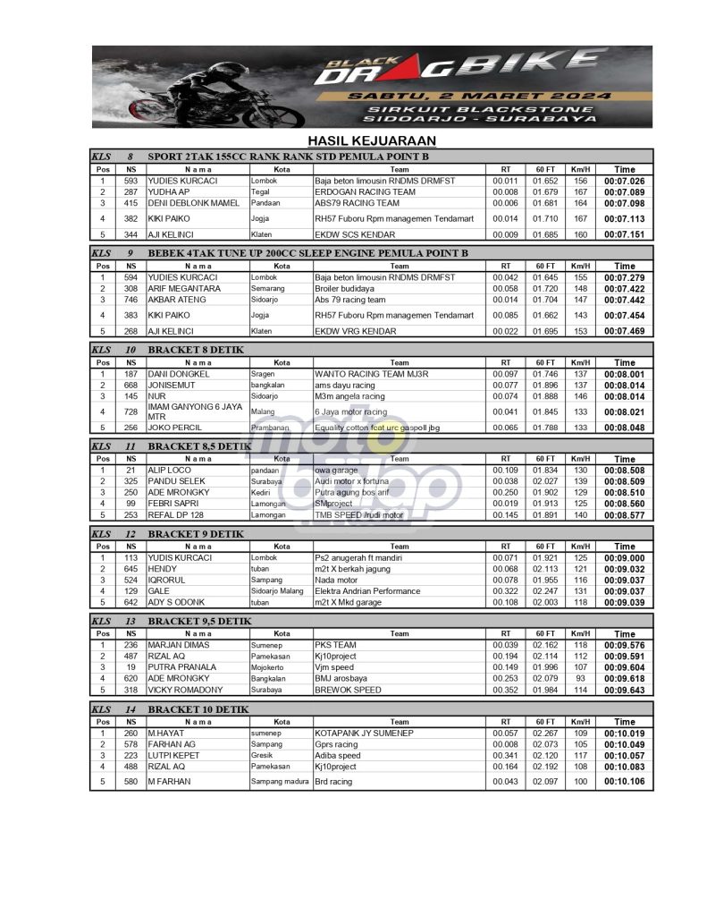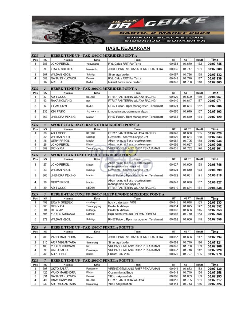MOTOBALAP.COM- Berikut adalah merupkan hasil kejuaraan balap track 201 Meter Black Drag Bike Series 2024 yang berlangsung di sirkuit Blackstone, Sidoarjo, Jawa Timus pada Sabtu 2 Maret 2024.