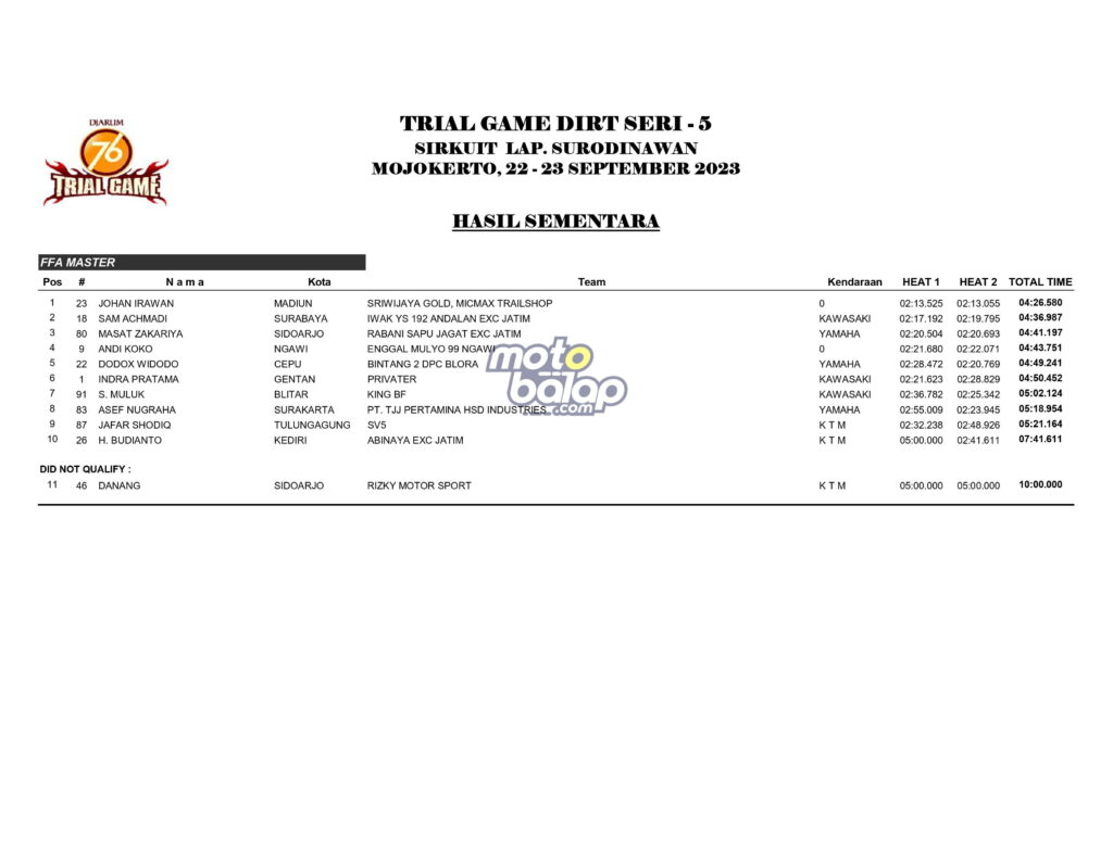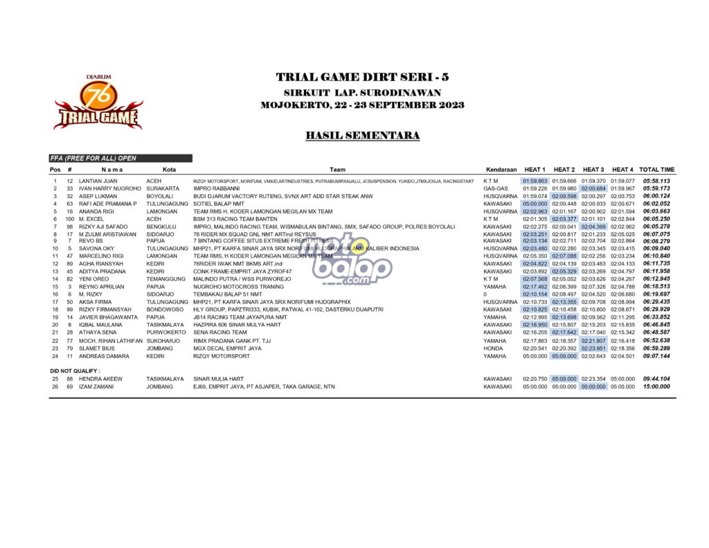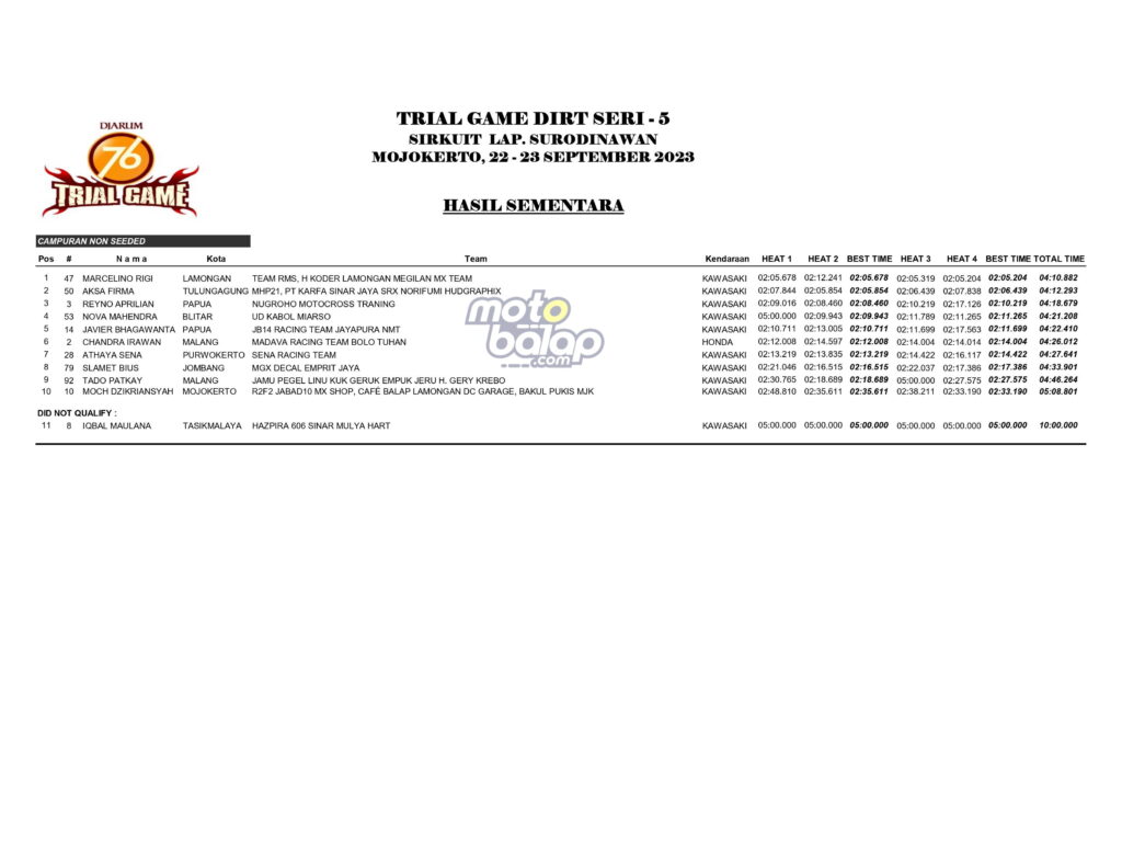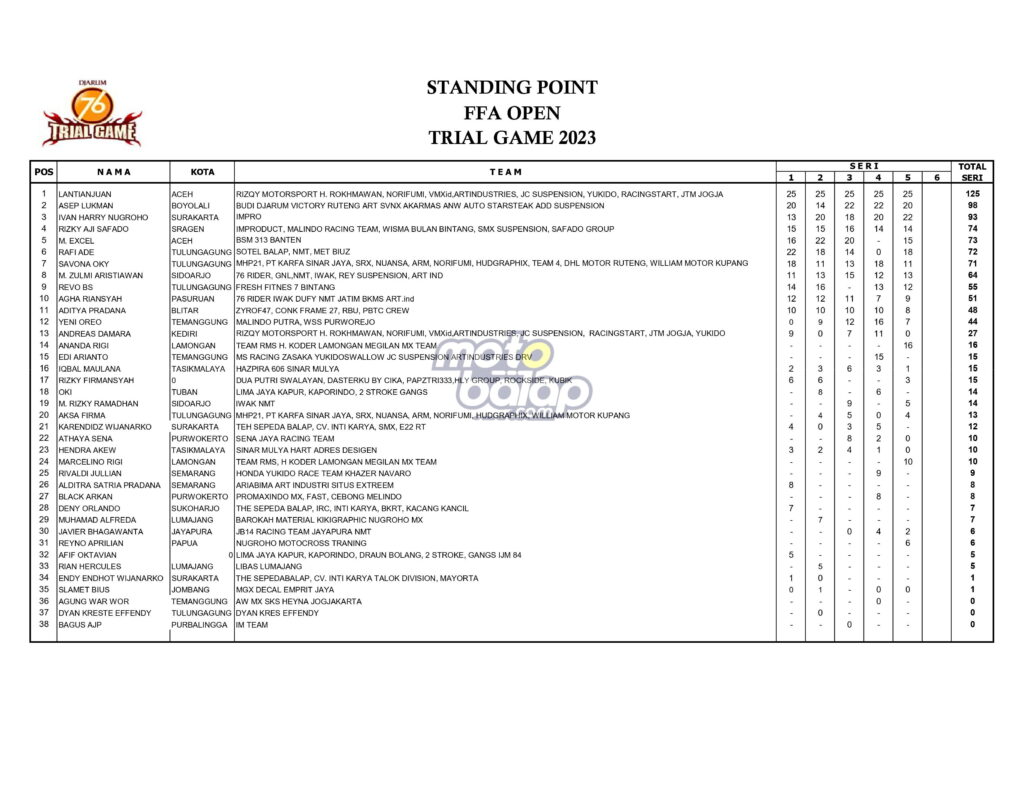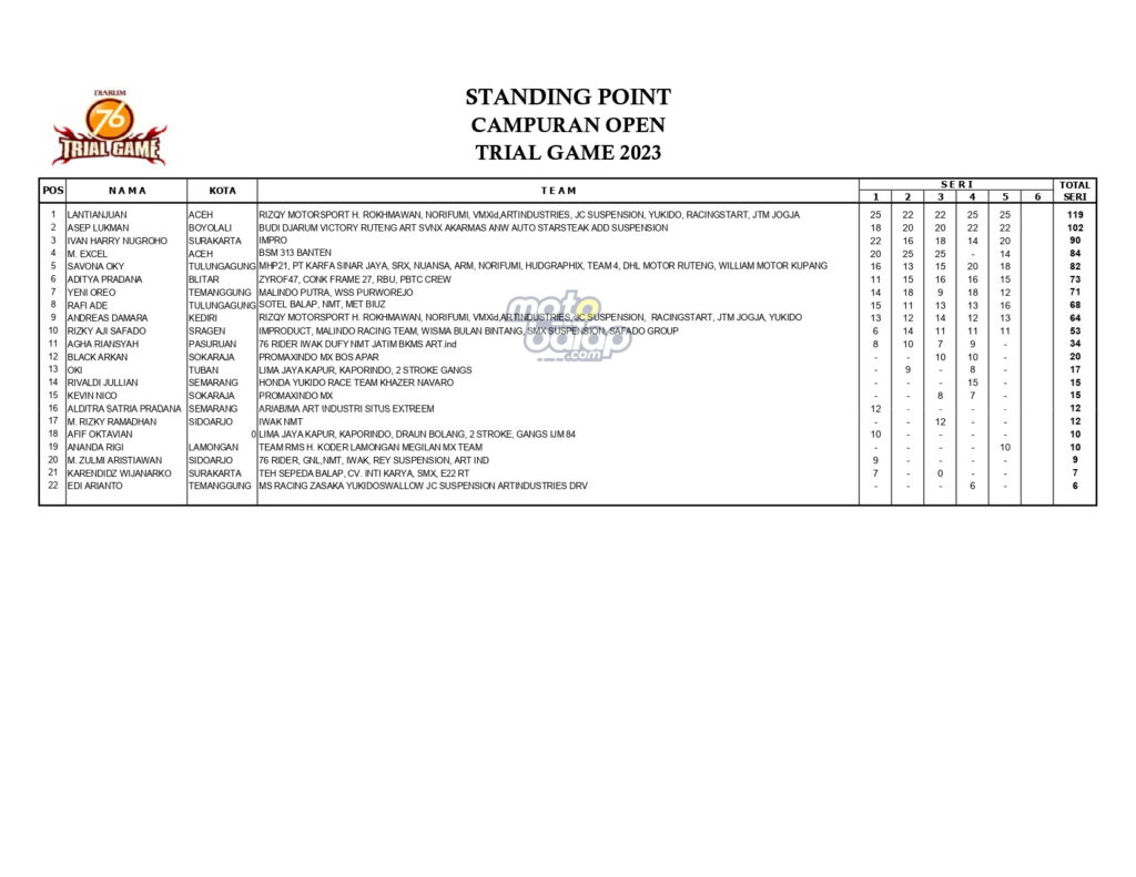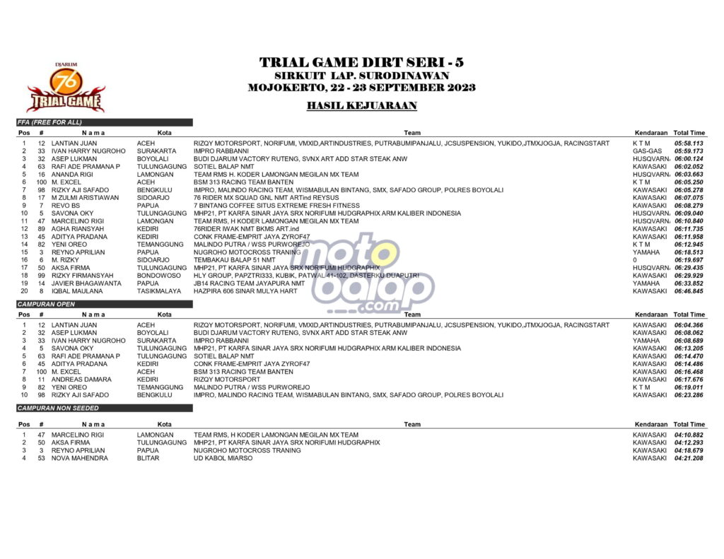 Dari keselurahan kelas yang dilombakan, di bawah Hasil Balap dan Standing Point Trail Game Dirt Seri-5 Mojokerto adalah sebagai berikut: