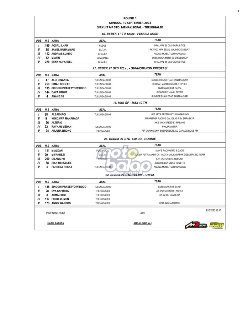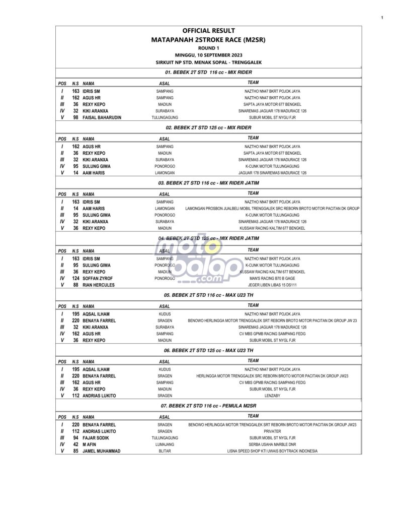 Dari keselurahan kelas yang dilombakan, di bawah ini Hasil Balap Motor M2SR Trenggalek adalah sebagai berikut: