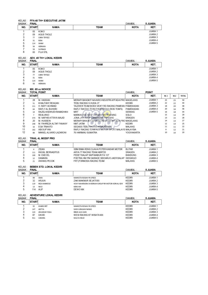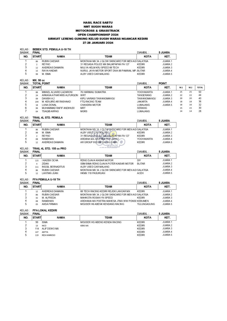 Dari keselurahan kelas yang dilombakan pada hari sabtu, di bawah ini merupakan Hasil lengkapnya :