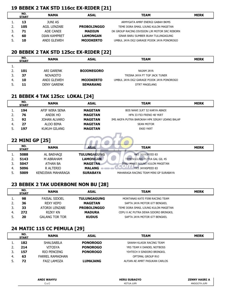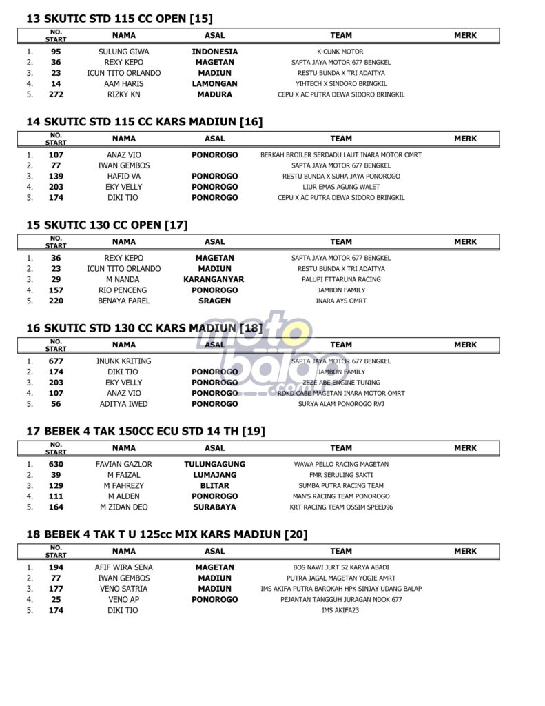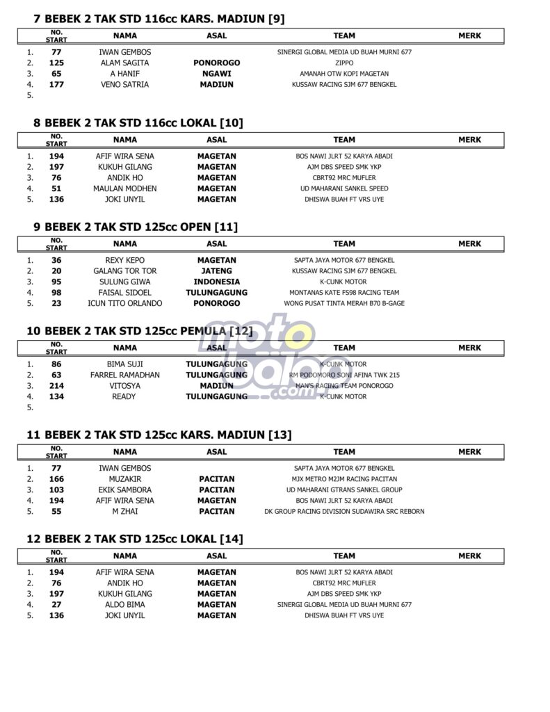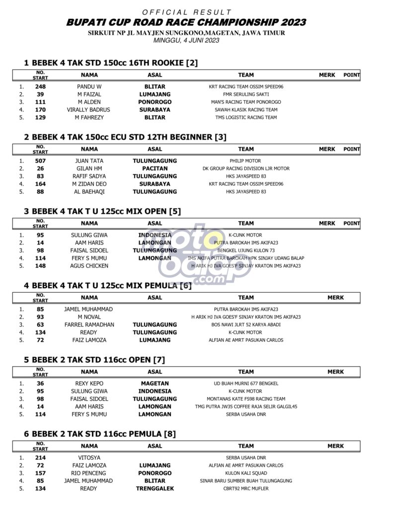 Dari kesulurahan kelas yang dilombakan, di bawah ini merupakan Hasil Bupati Magetan Cup Road Race Championship 2023 adalah sebagai berikut: