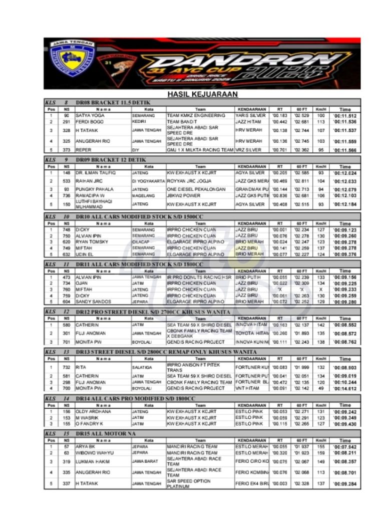 Dari seluruh kelas yang dilombakan, di bawah ini merupakan hasil DANDRON 31 AYC CUP Drag Race 2025 adalah sebagai berikut: