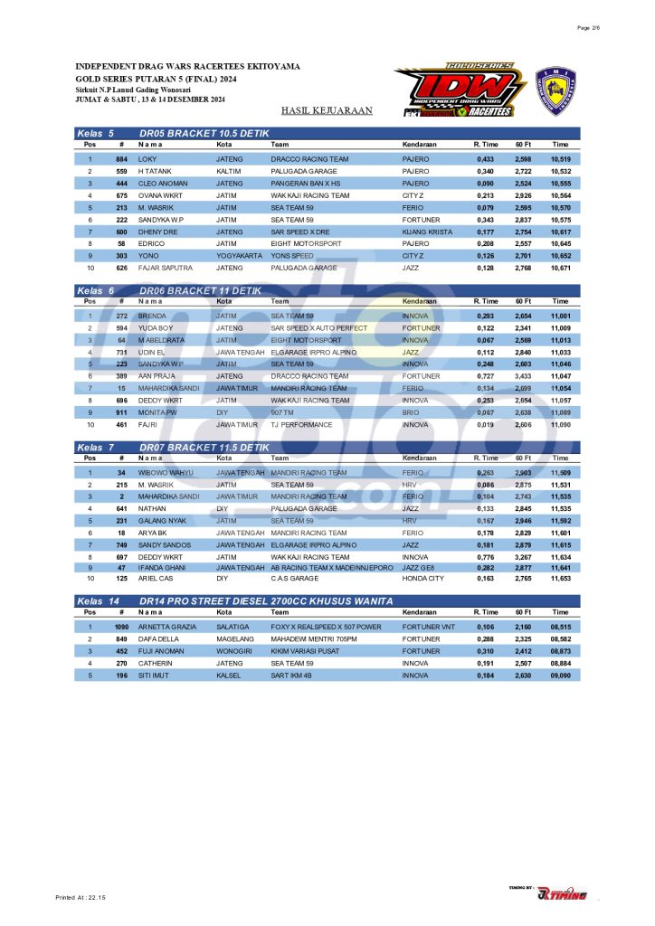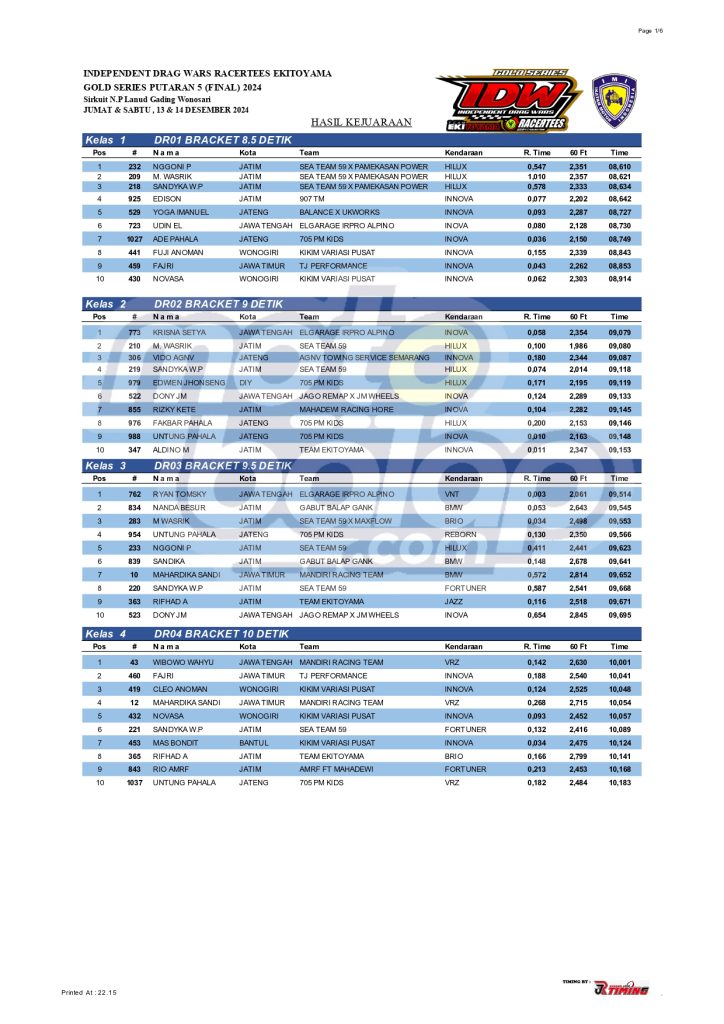 Dari seluruh kelas yang dilombakan, di bawah ini merupakan Hasil Drag Bike Final Independent Drag Wars (IDW) 2024 Gold Series adalah sebagai berikut: