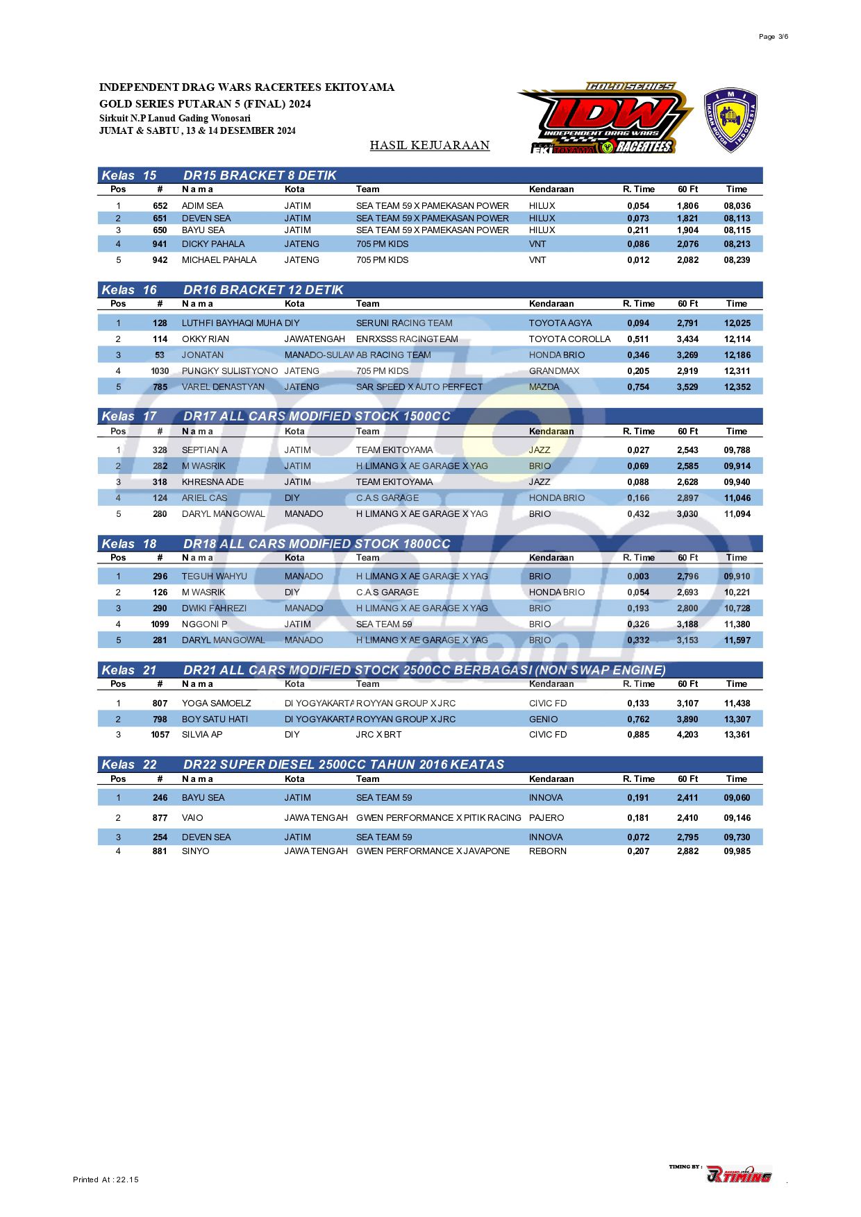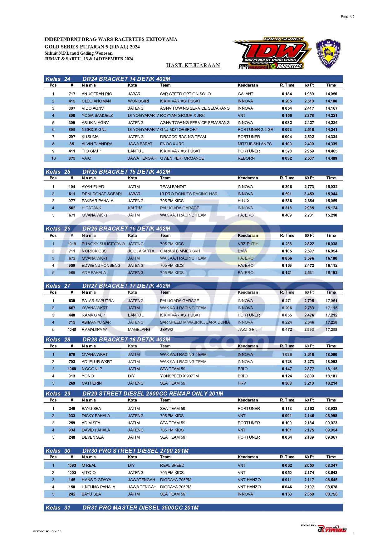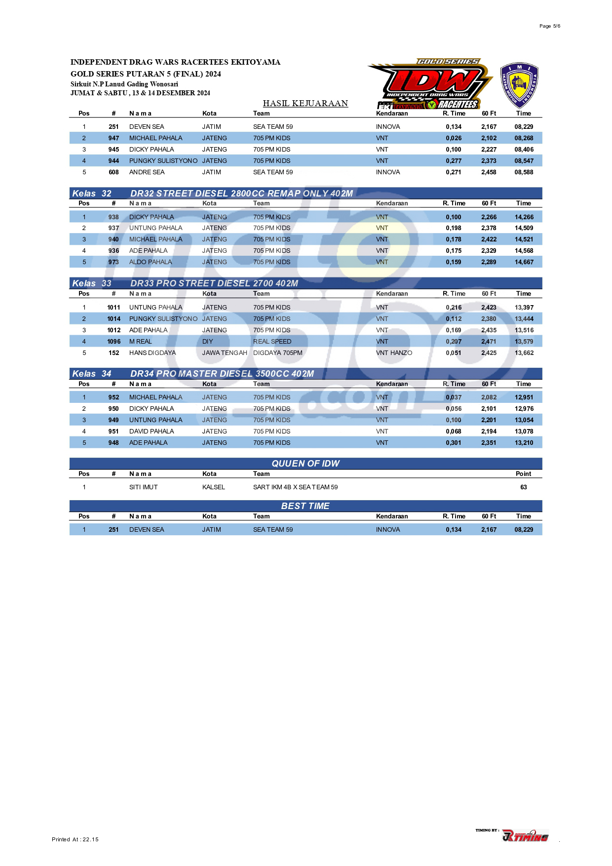 Dari seluruh kelas yang dilombakan, di bawah ini merupakan Hasil Drag Bike Final Independent Drag Wars (IDW) 2024 Gold Series adalah sebagai berikut: