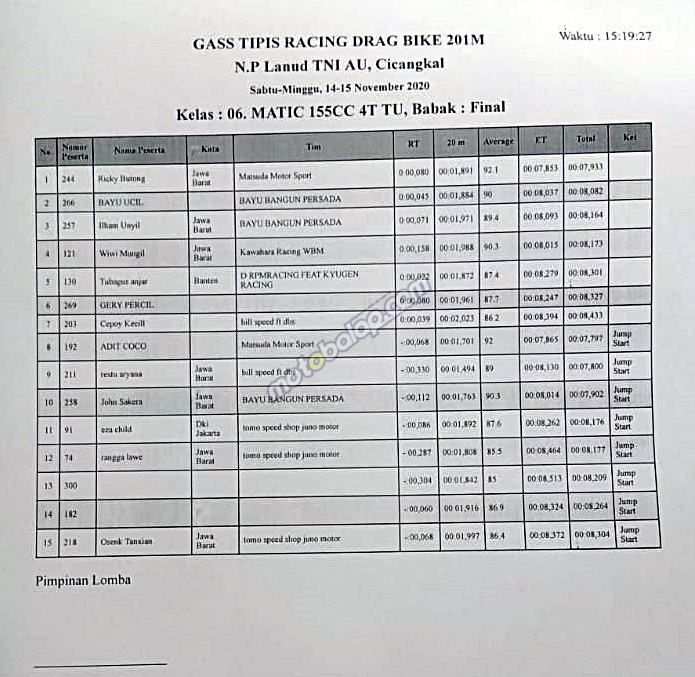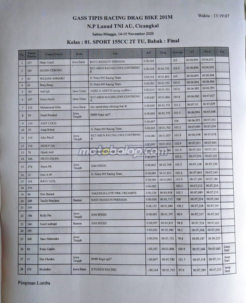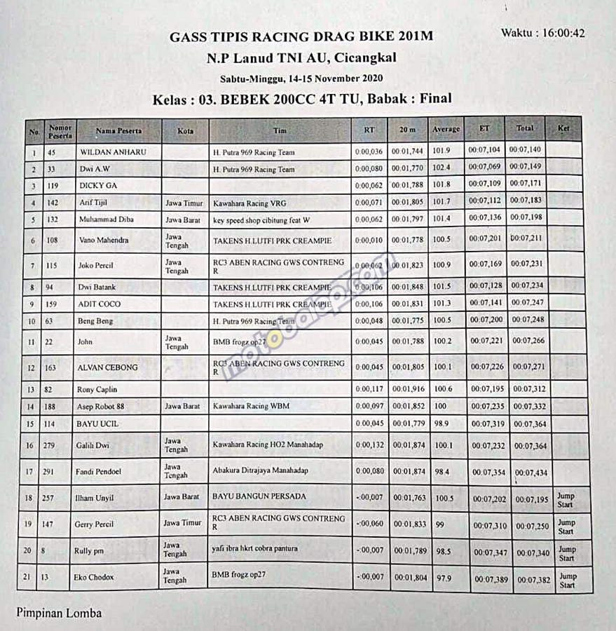 Hasil Drag Bike Gass Tipis Racing Sabtu, 14 November 2020 Lanud Cikangkal: