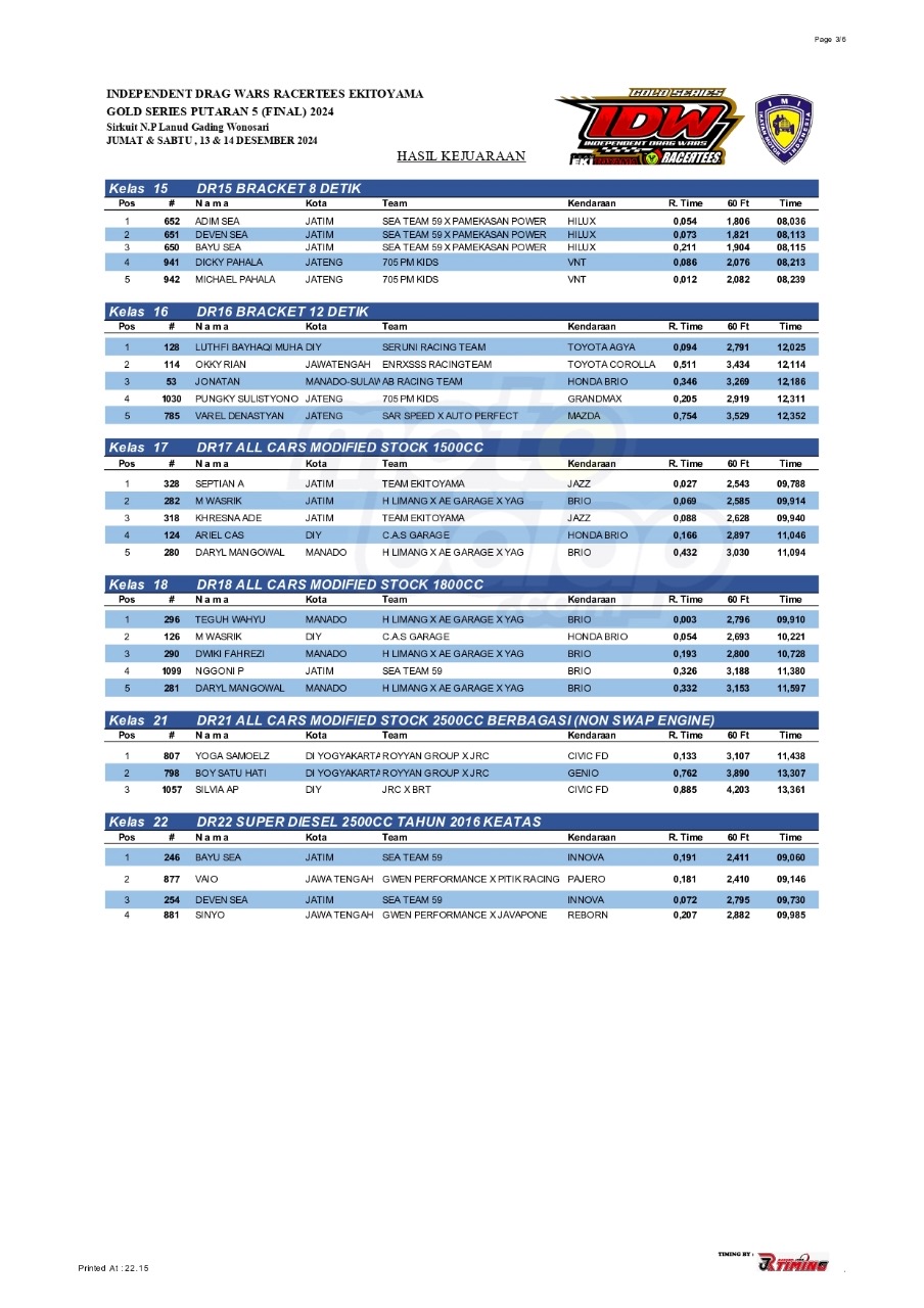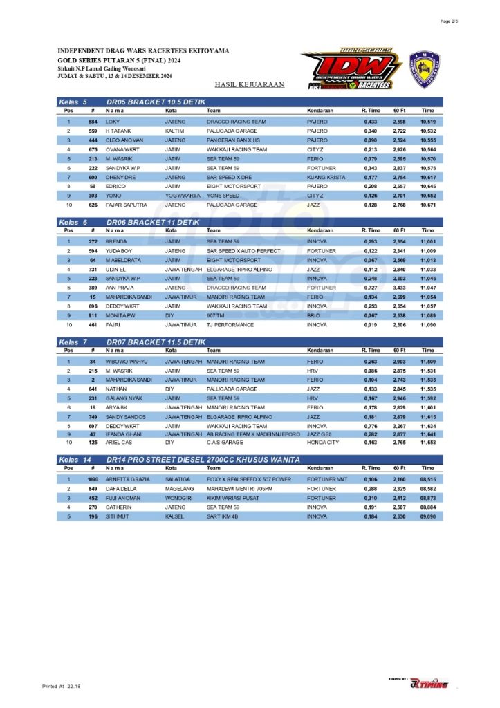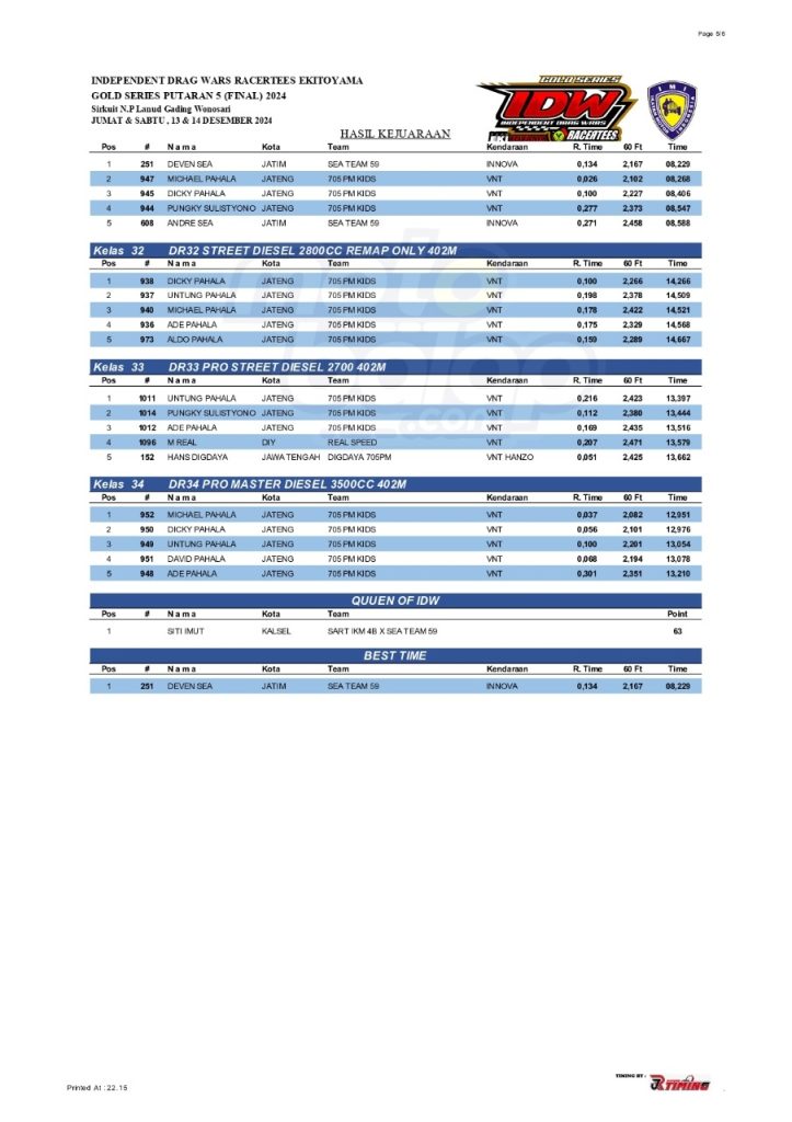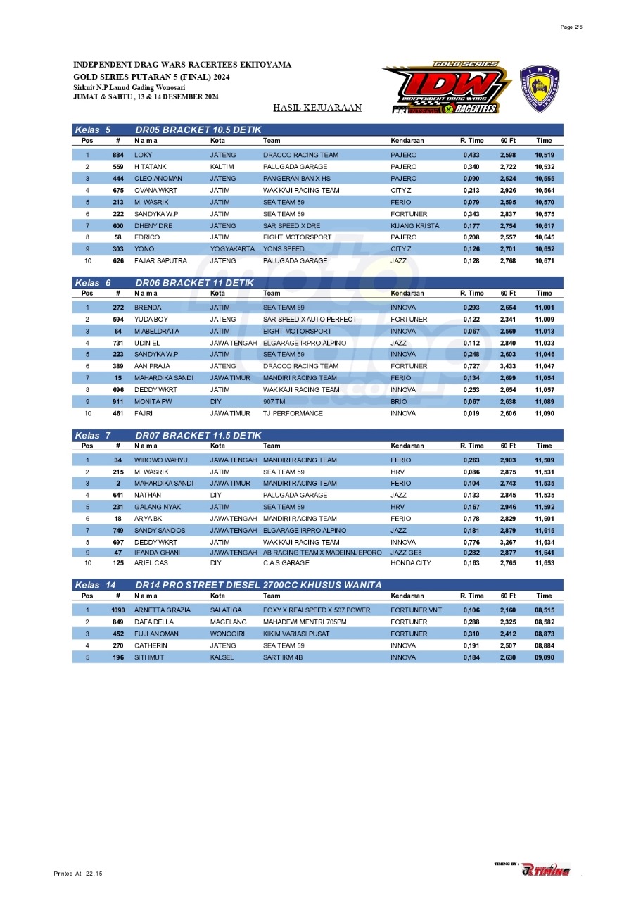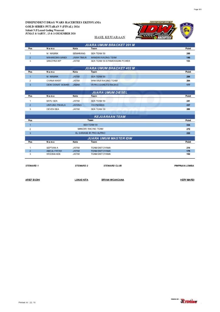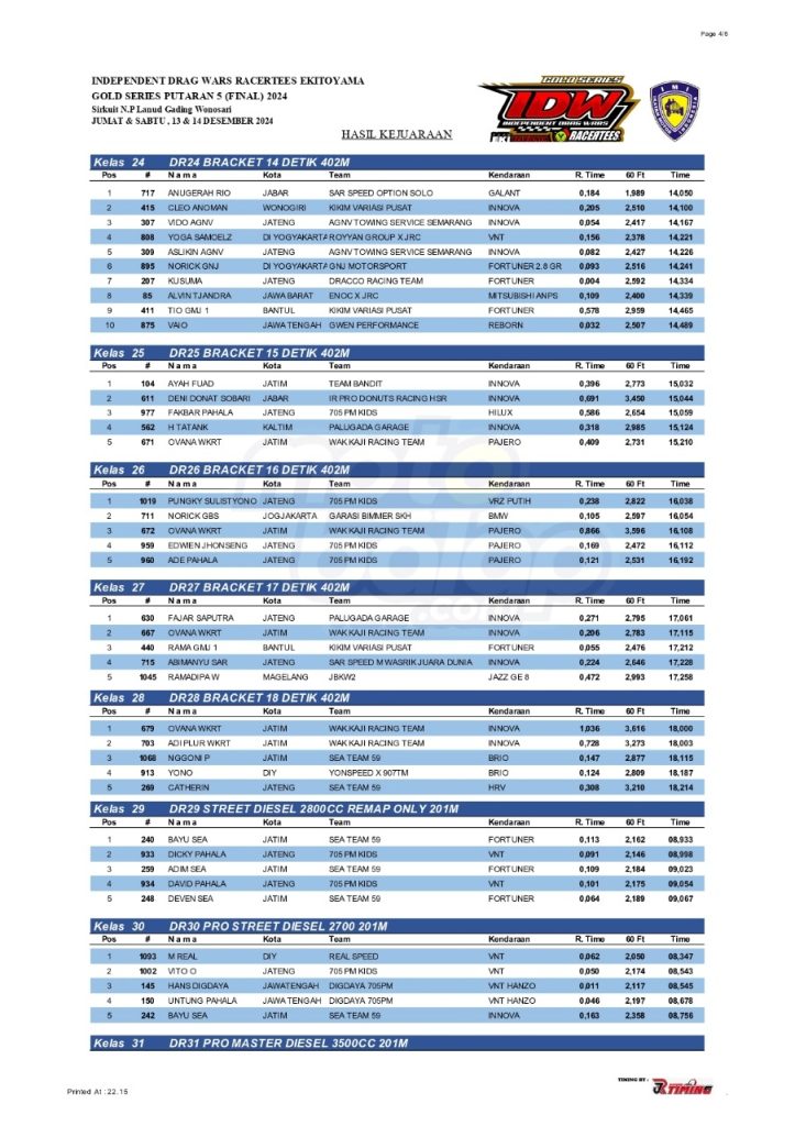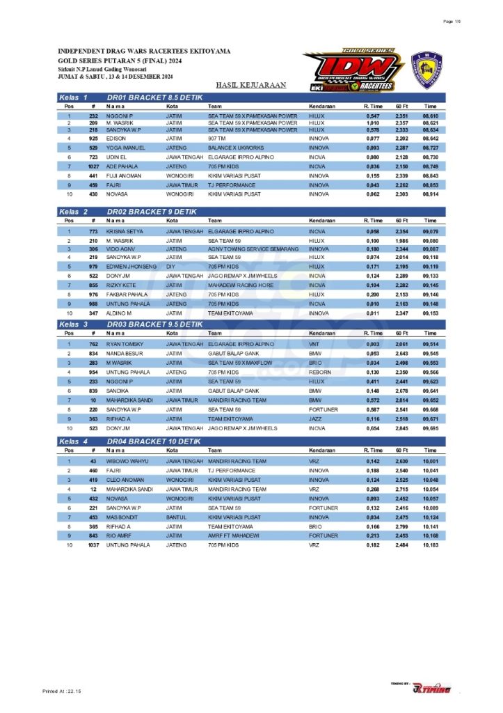 Dari seluruh kelas yang dilombakan, di bawah ini merupakan Hasil Drag Race Final Independent Drag Wars (IDW) 2024 Gold Series adalah sebagai berikut: