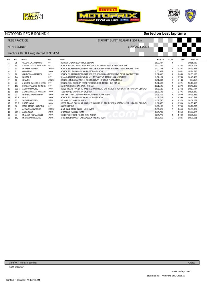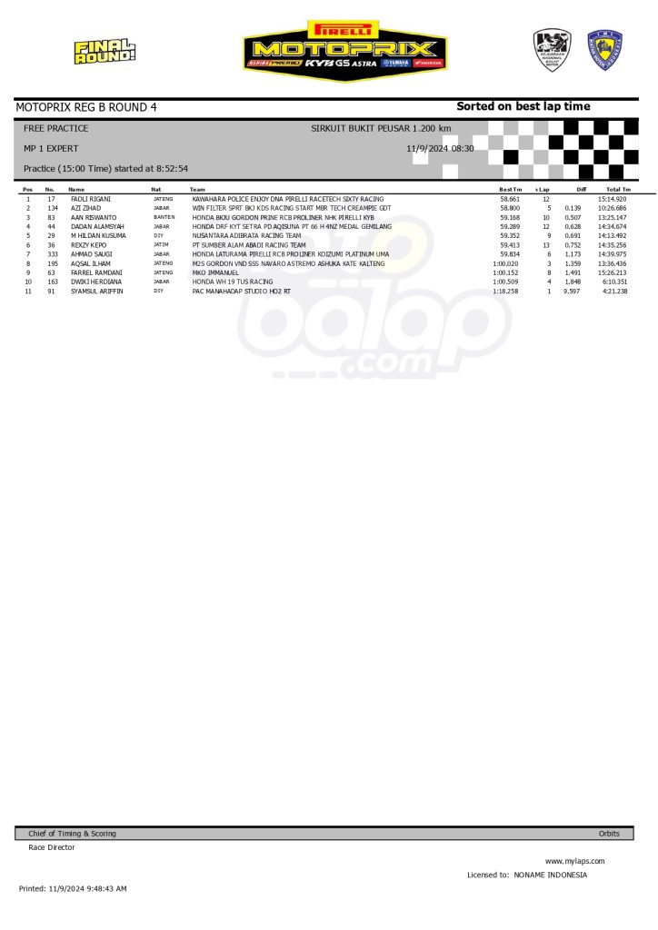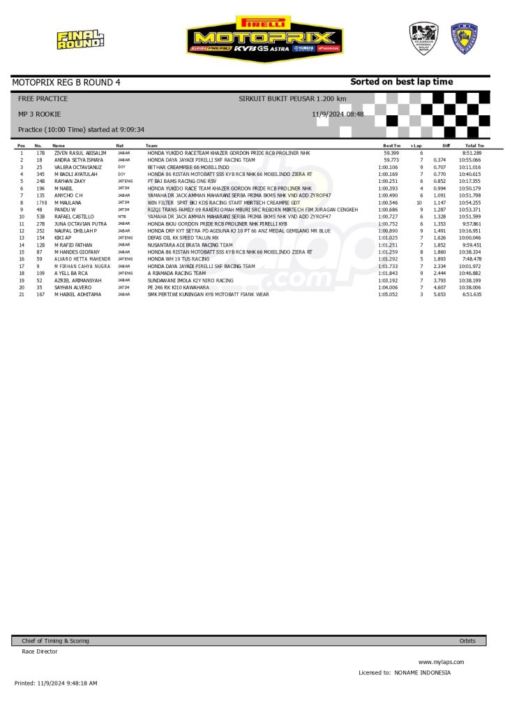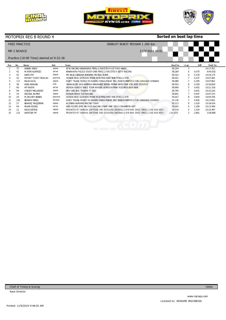 Dari keseluruhan kelas yang dilombakan, di bawah ini merupakan Hasil Free Practice( FP) Kejurnas Motoprix Tasikmalaya adalah sebagai berikut: