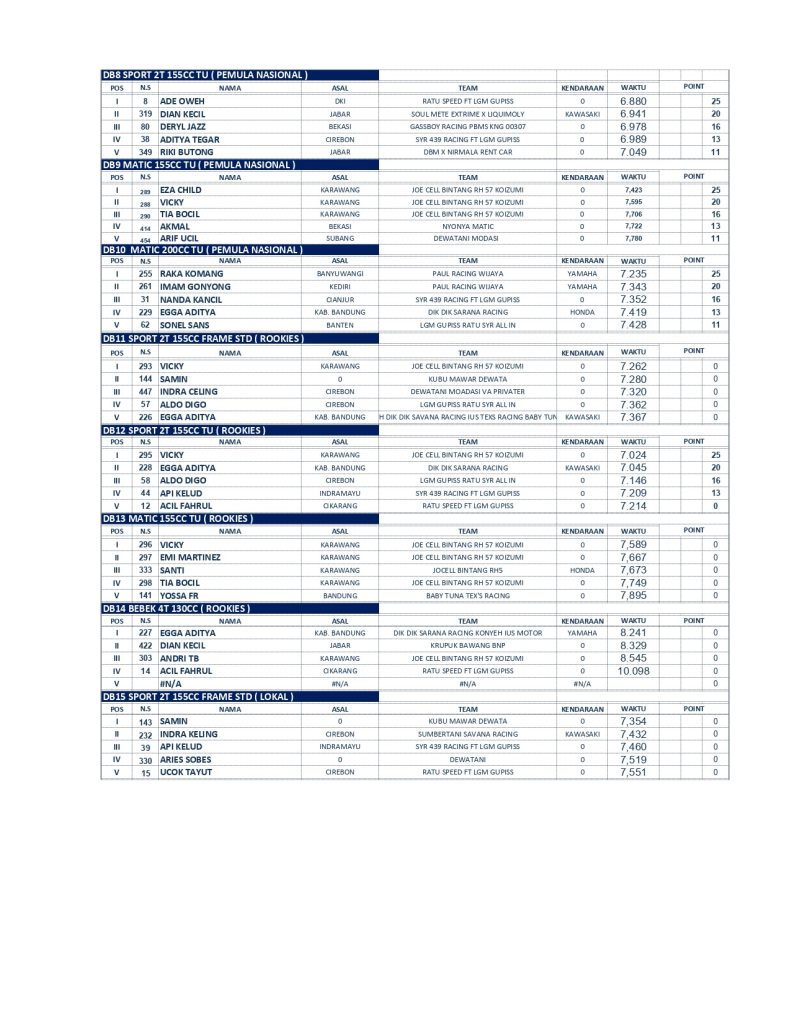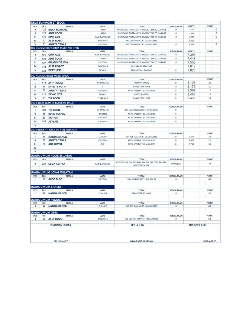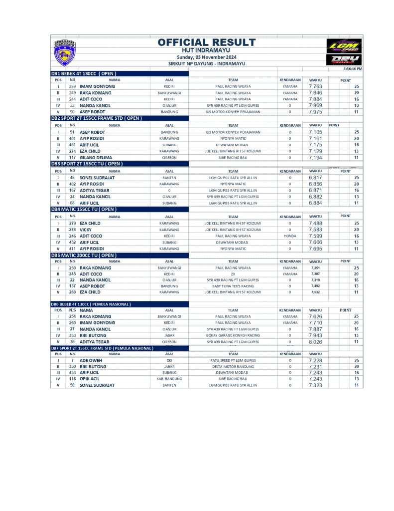 Dari keseluruhan kelas yang dilombakan, di bawah ini merupakan hasil Indonesia Open Drag Bike Indramayu sebagai berikut: