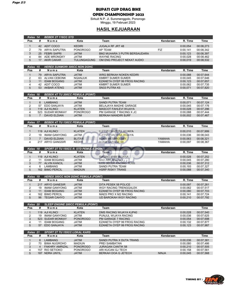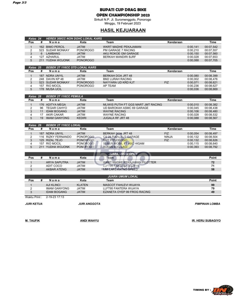 Di bawah ini merupakan Hasil Juara Bupati Cup Drag Bike Open Championship 2023 adalah sebagai berikut: