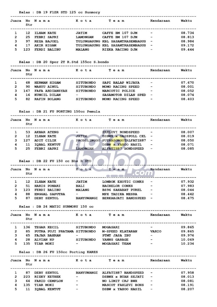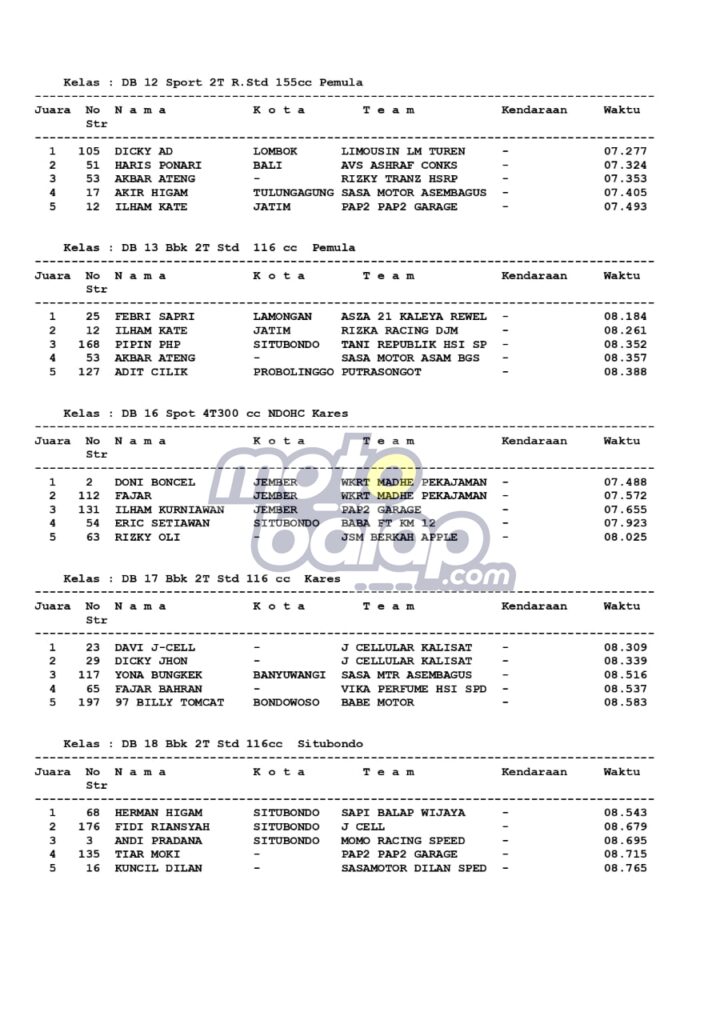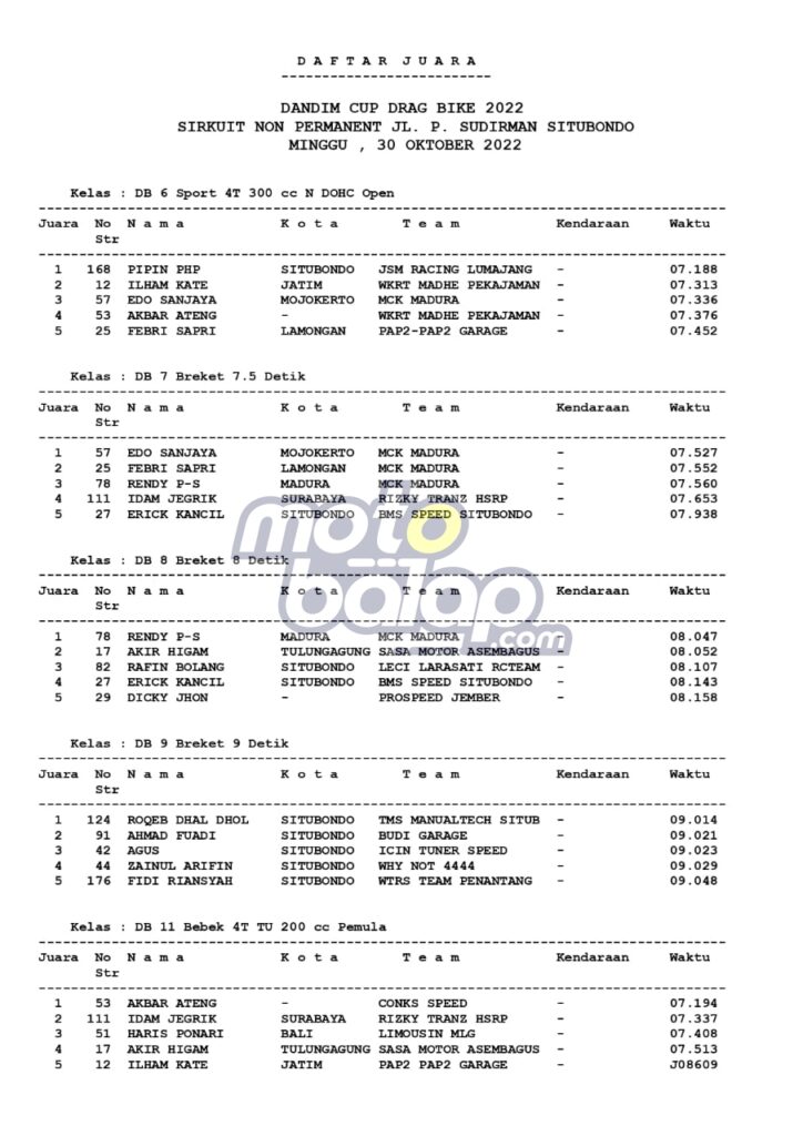 Di Bawah ini merupakan hasil juara dari Dandim Cup Drag Bike 2022 adalah sebagai berikut: