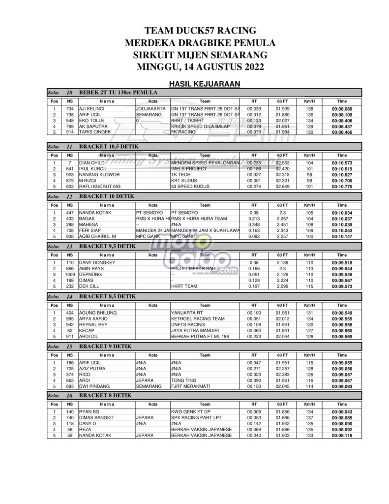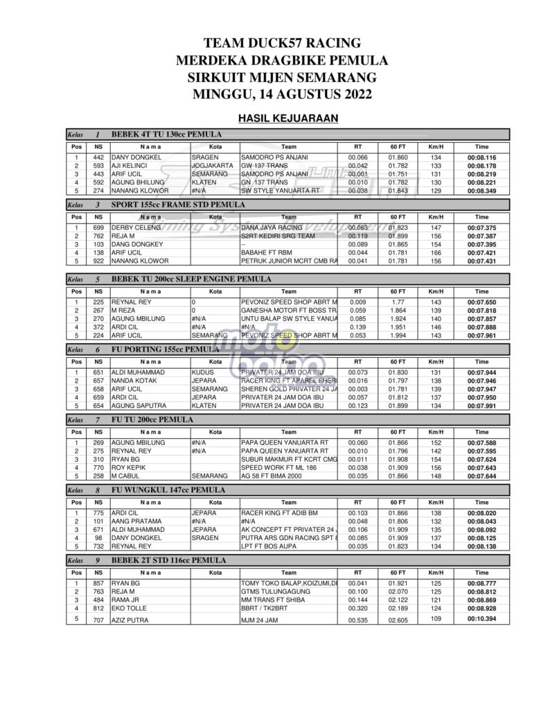 Di bawah ini merupakan Hasil Juara Duck57 Merdeka Drag Bike Pemula Mijen 2022: