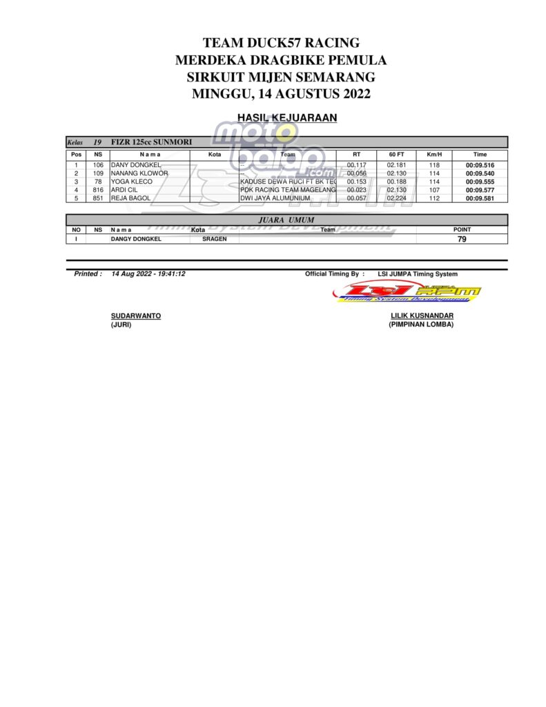 Hasil Juara Duck57 Merdeka Drag Bike Pemula Mijen 2022