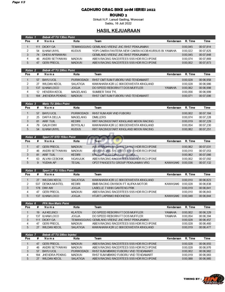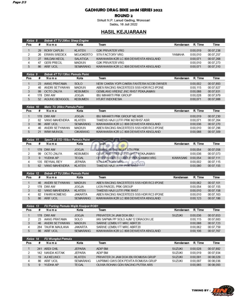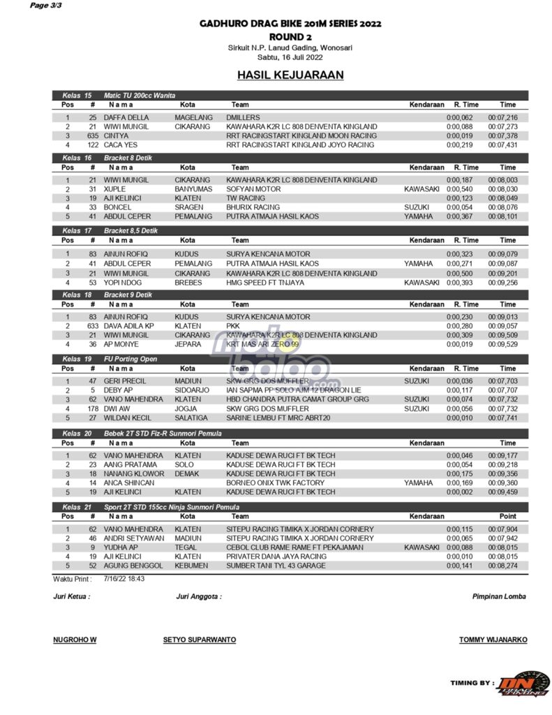 Di bawah ini merupakan hasil juara Gadhuro Drag Bike Putaran 2 Wonosari 2022 adalah sebagai berikut: