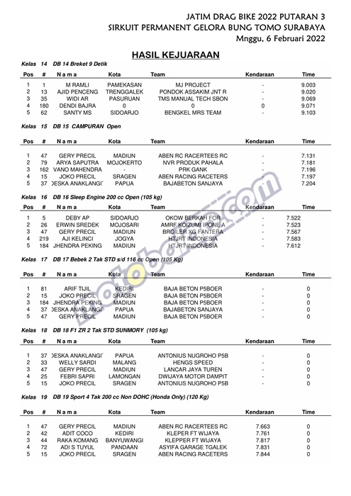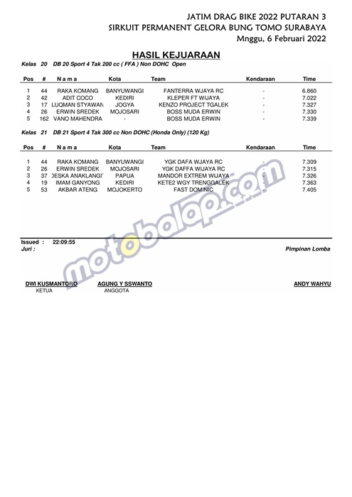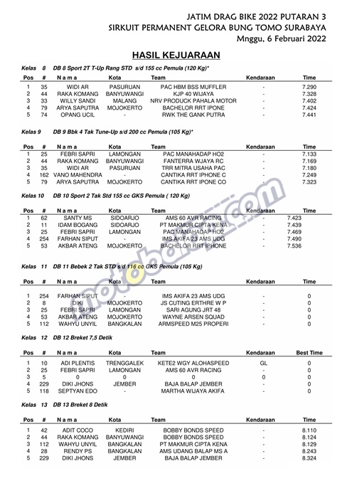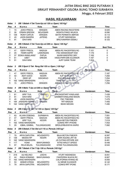 Untuk lebih jelas, berikut merupakan hasil juara setiap kelas Jatim Drag Bike Championship putaran 3 yang dihelat di sirkuit Golora Bung Tomo, Surabaya, Minggu (06/02/2022) adalah sebagai berikut: