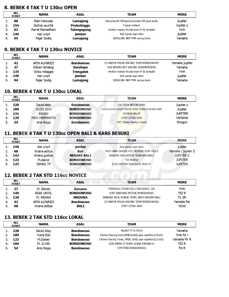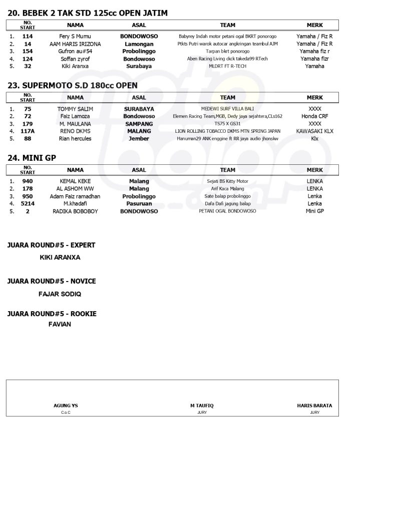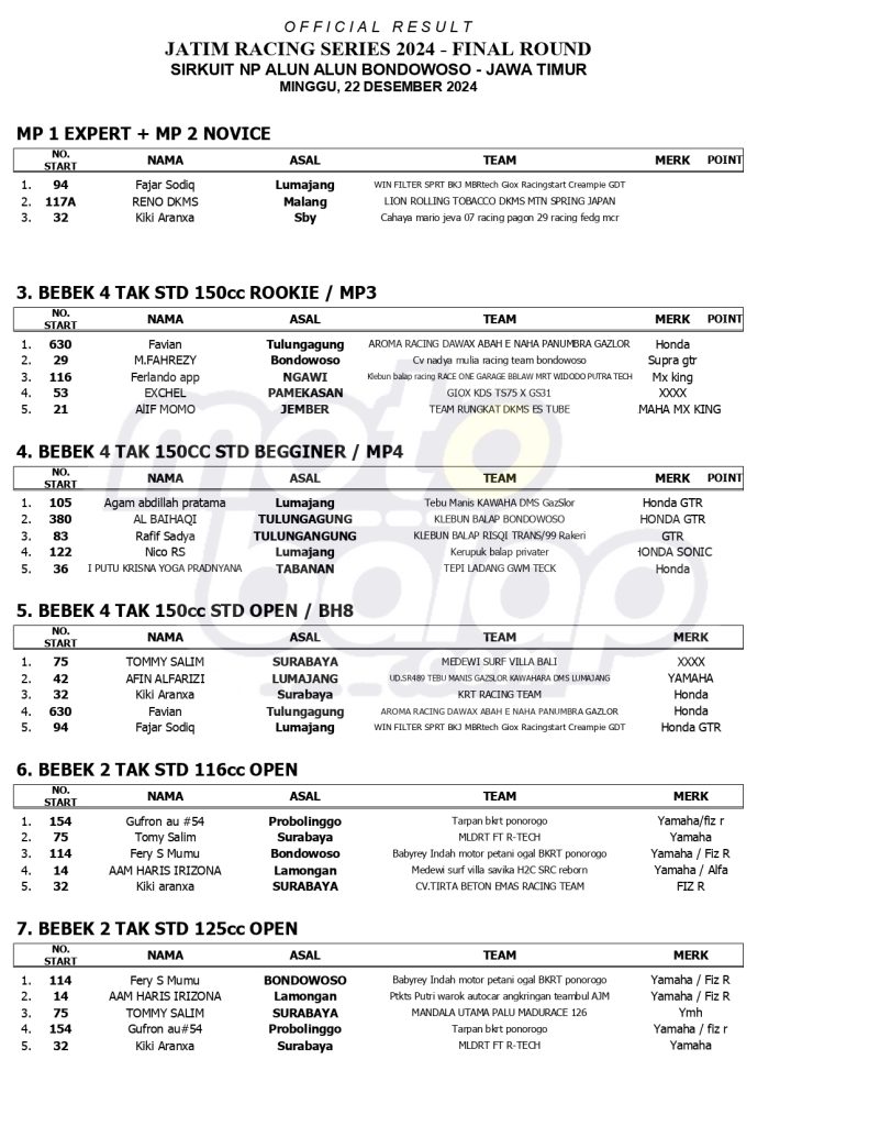 MOTOBALAP.COM – Berikut ini adalah hasil juara Jatim Racing Series Final Round 2024, yang berlangsung hari ini di Sirkuit NP. Alun-Alun Bondowoso (22/12) :