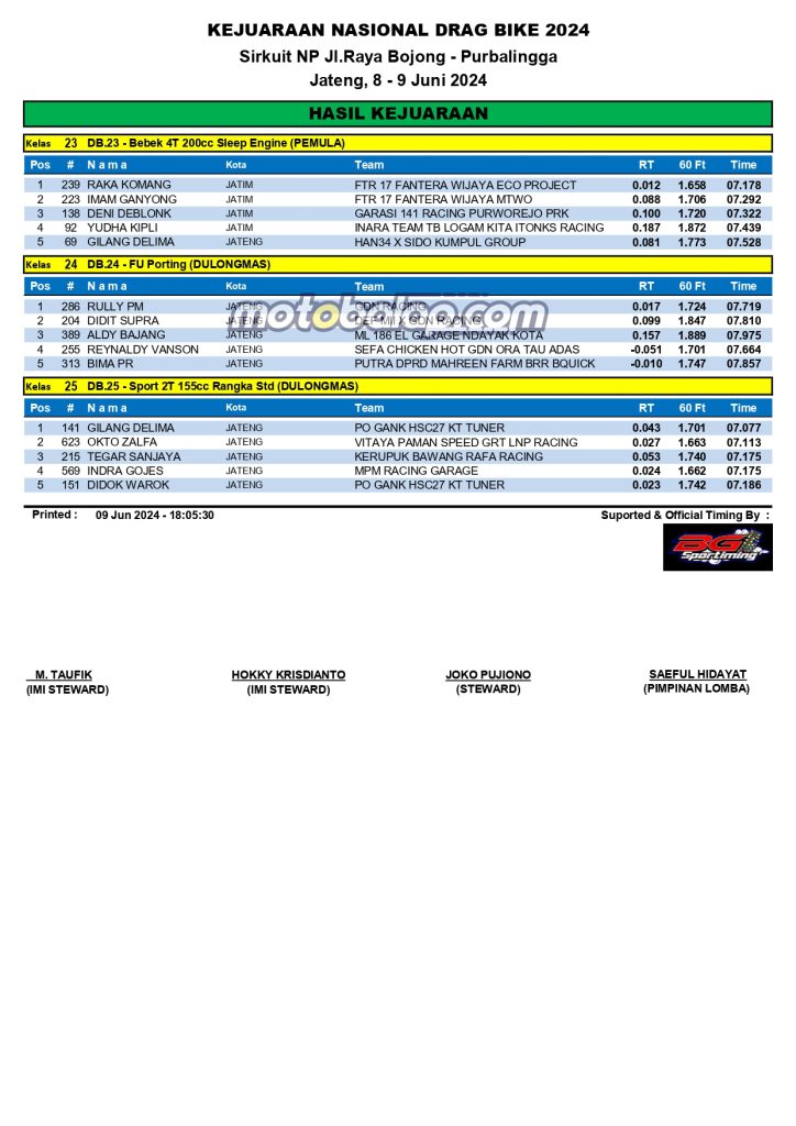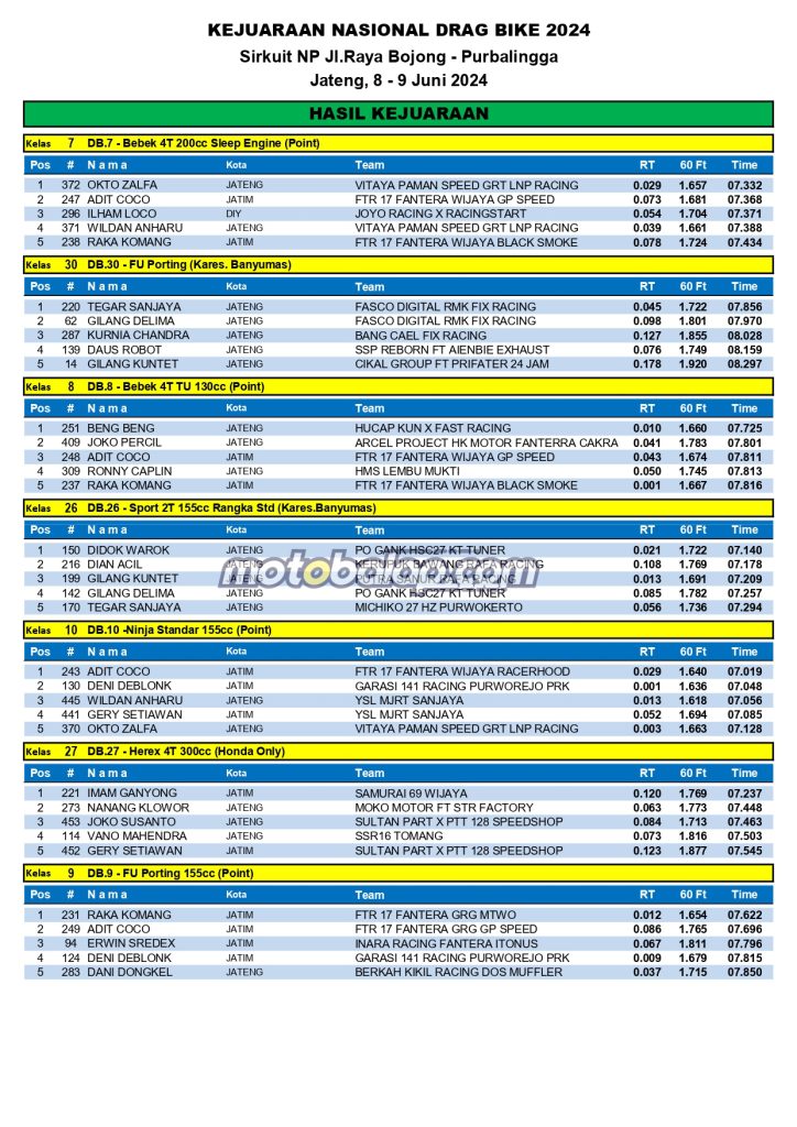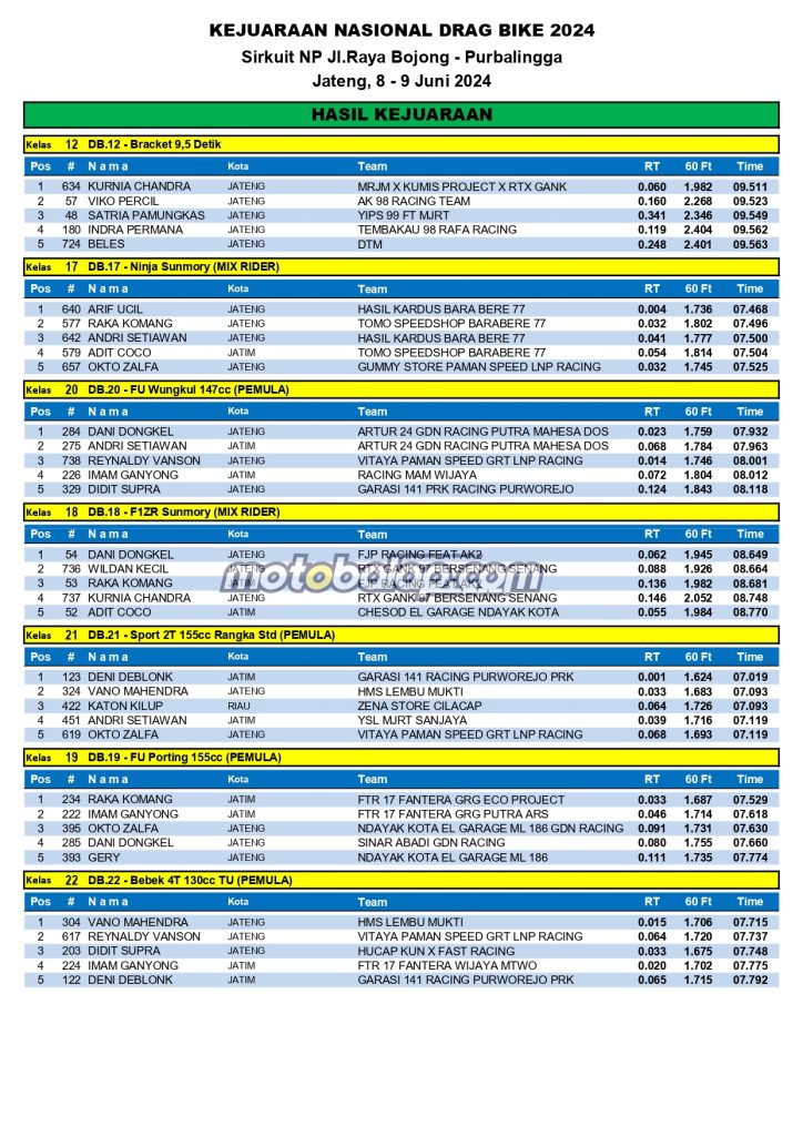 MOTOBALAP.COM- Berikut ini merupakan hasil lengkap Kejurnas Drag Bike 2024 Seri 1 yang berlangsung di Sirkuit Jl. Bojong, Purbalingga (9/6).