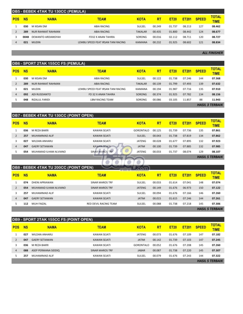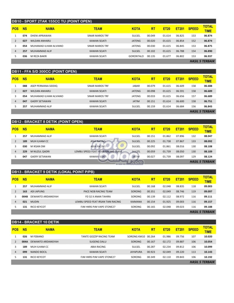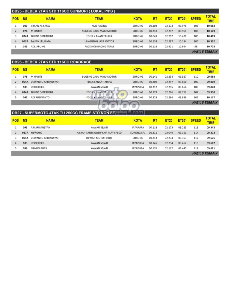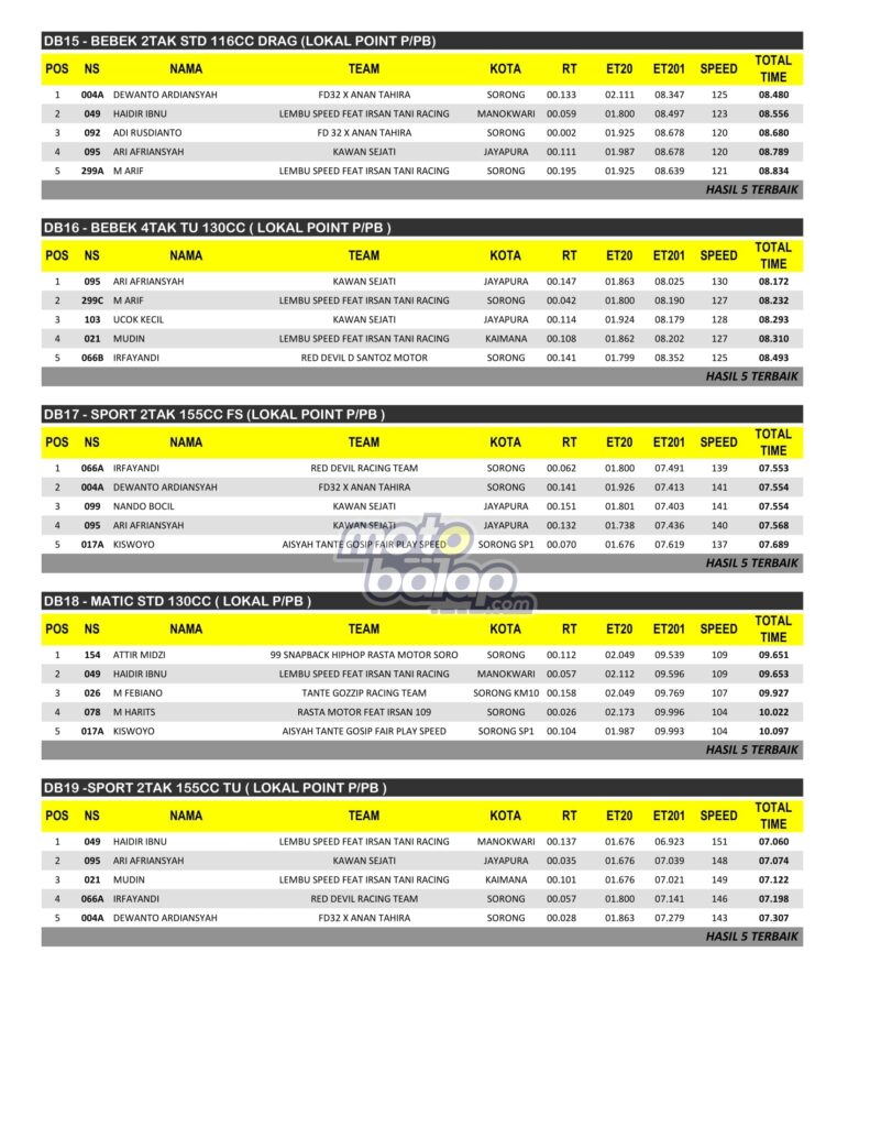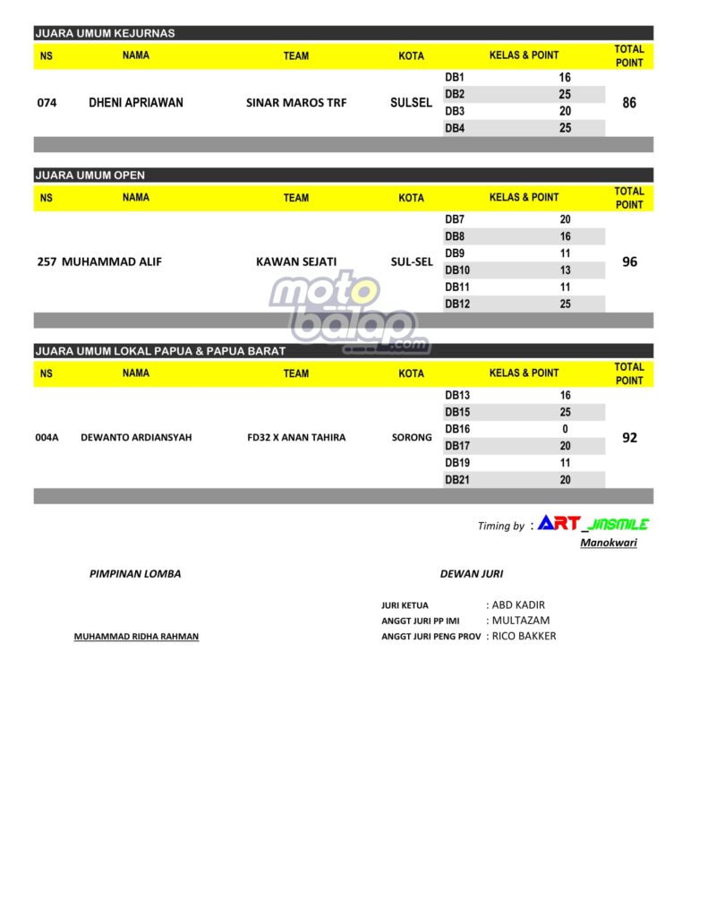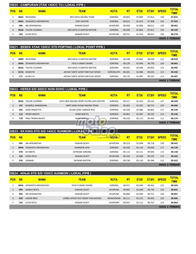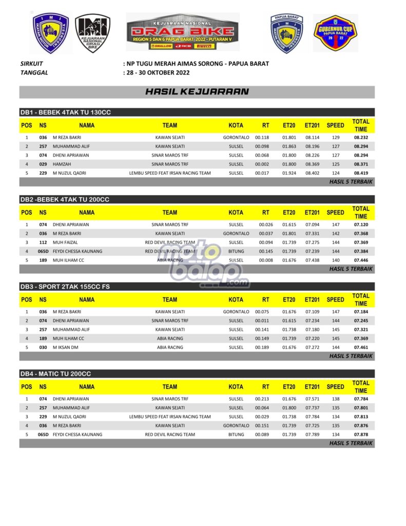 Di Bawah ini merupakan hasil juara dari Kejurnas Drag Bike Region 5 & 6 Papua Barat 2022 Putaran V adalah sebagai berikut: [Fahry Fathony]